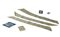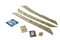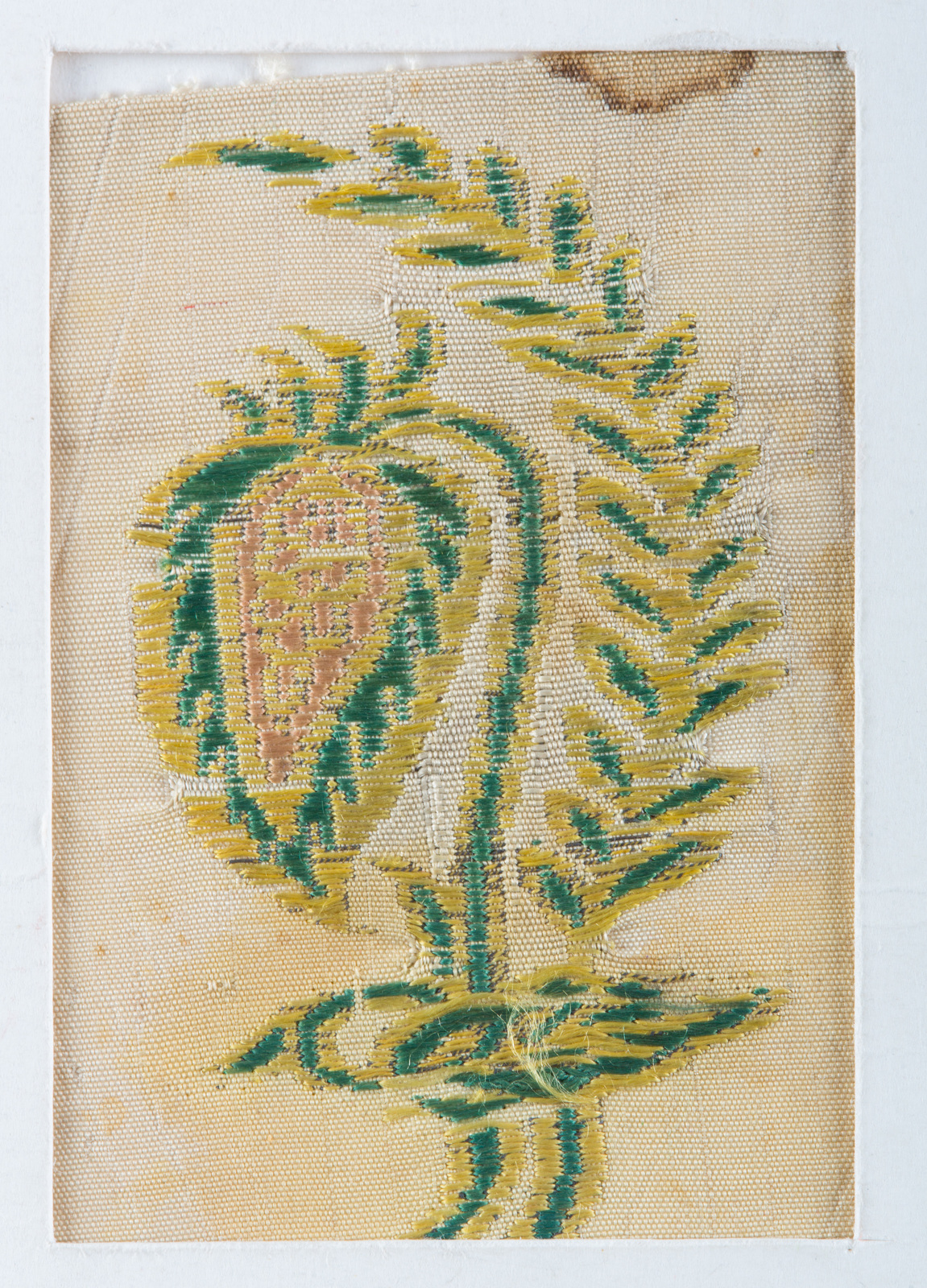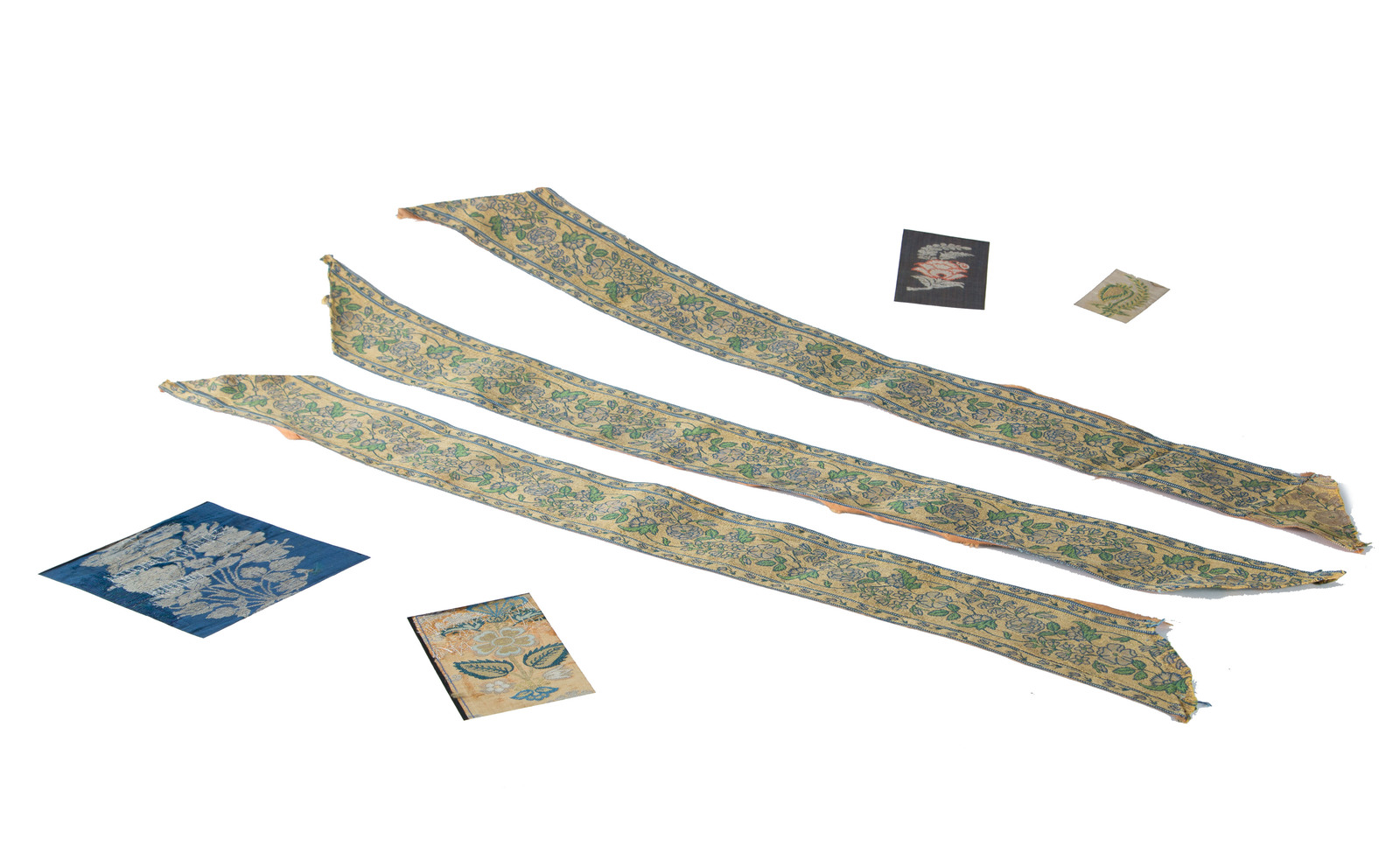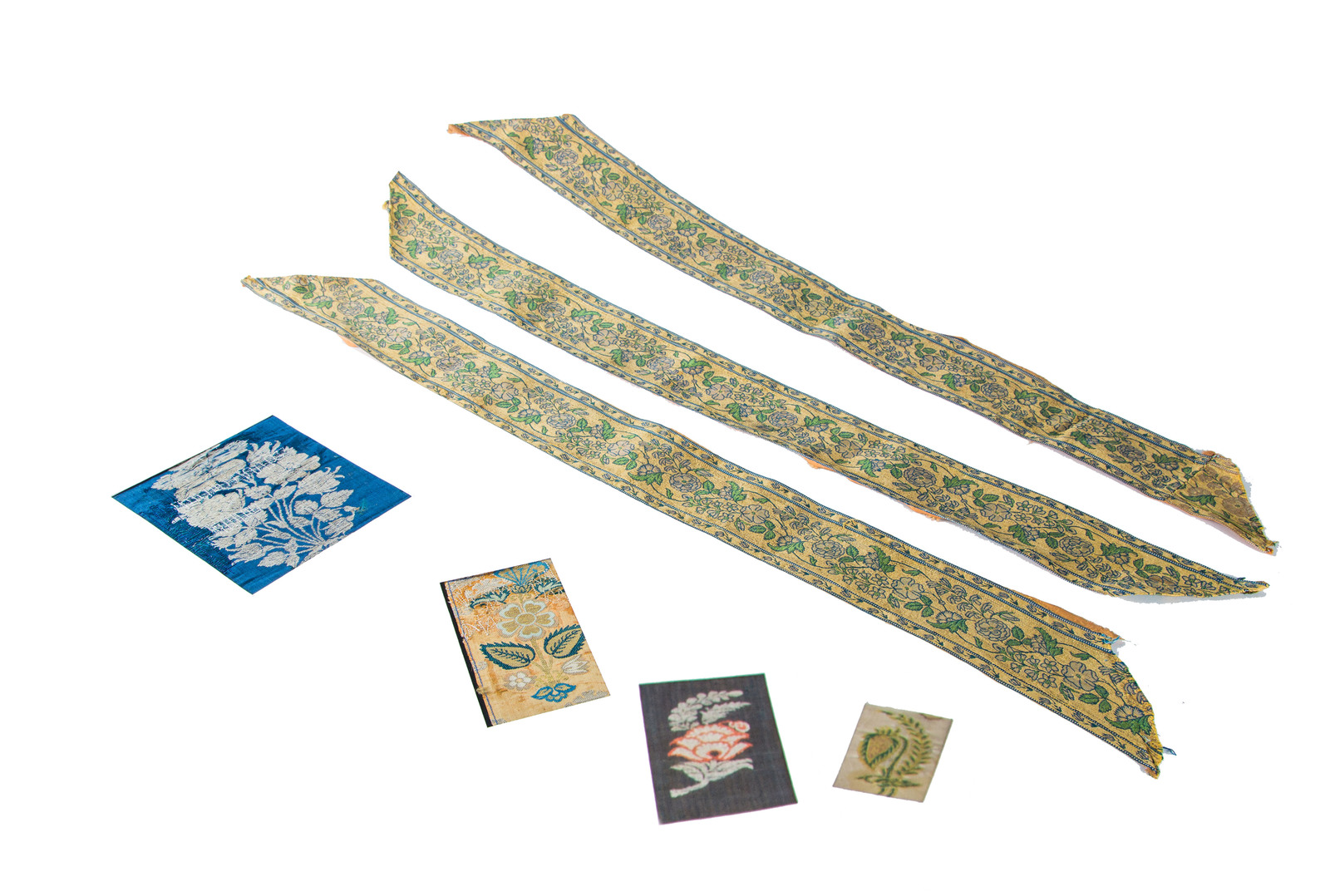 India, XVII secolo . . Cm 74,00. Tre strisce di tessuto in seta decorato con fiori color lavanda e foglie verdi su sfondo crema e quattro frammenti di tessuti variopinti, ancora ricamati a motivo floreale e montati su passpartout, possibilmente eseguiti in Europa su modello indiano.