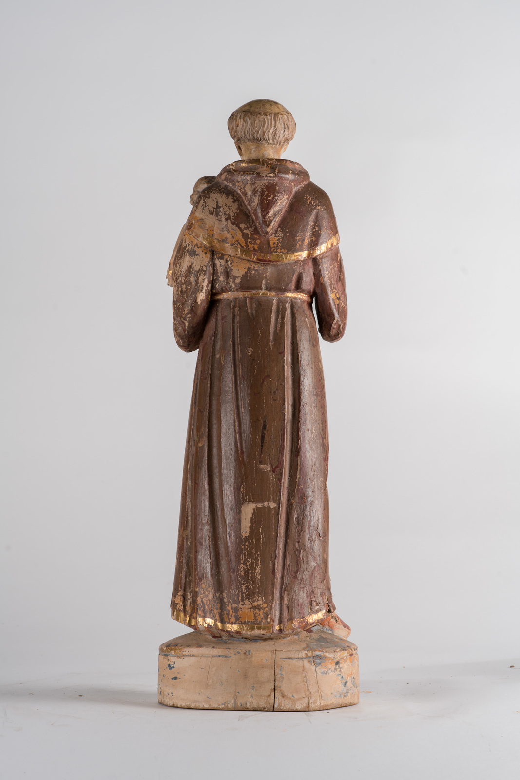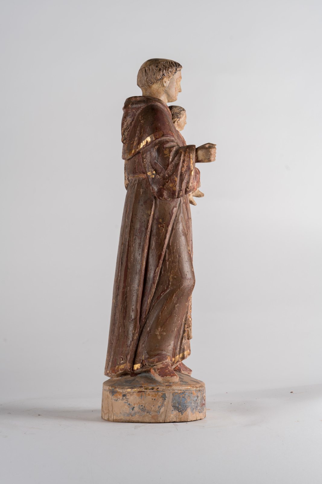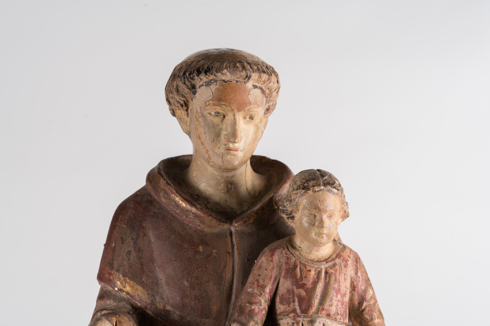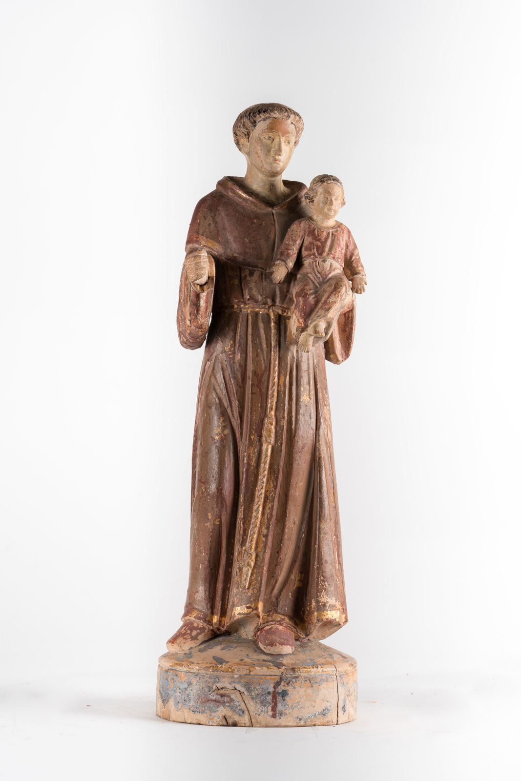 Arte Indiana Scultura in legno dipinto raffigurante Sant'Antonio da Padova con Gesù Bambino