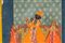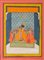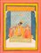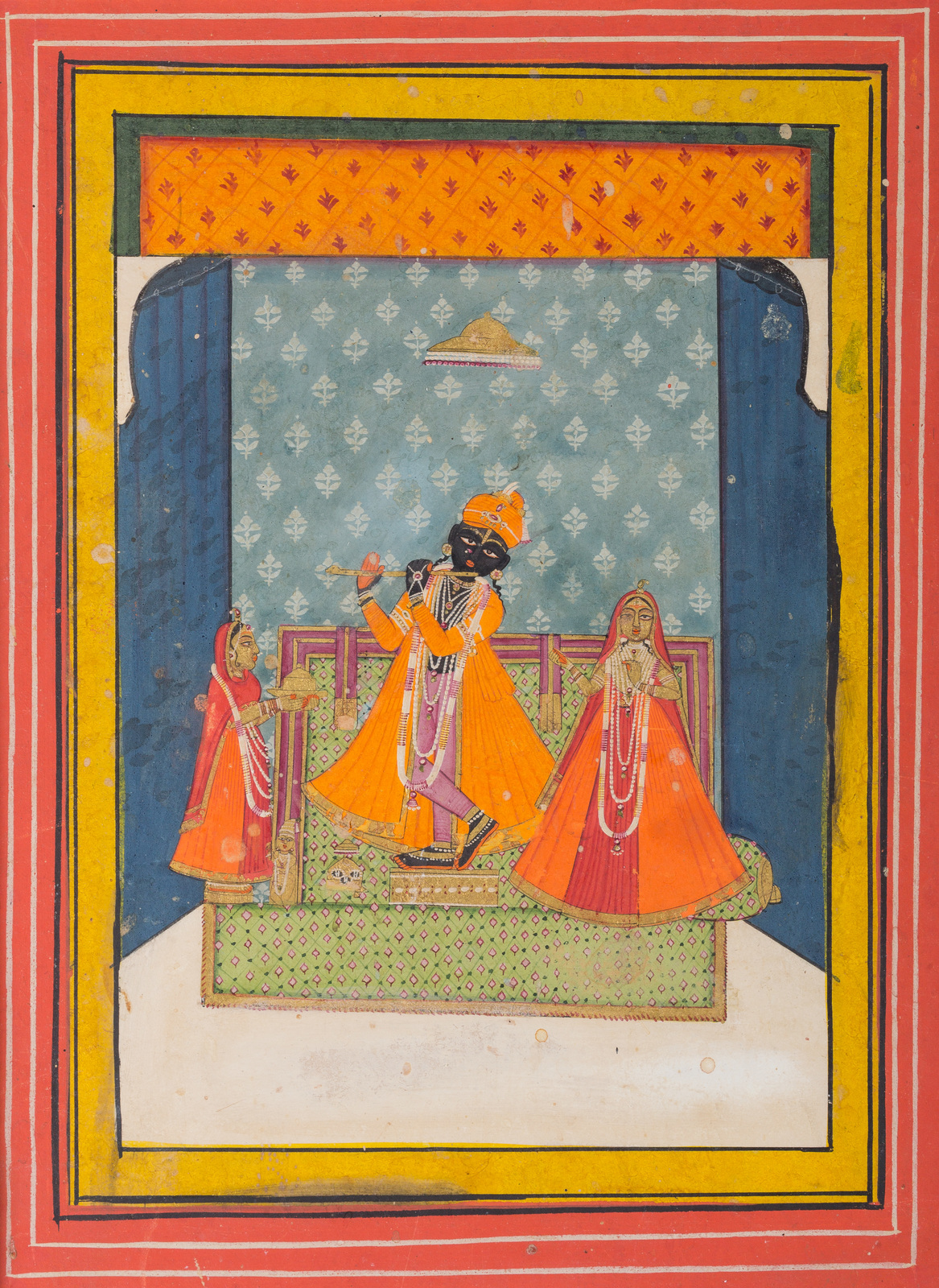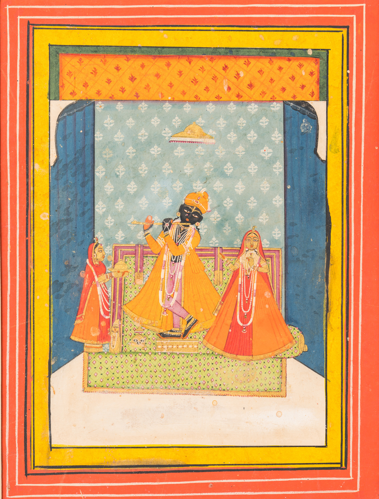 Arte Indiana Miniatura raffigurante Krishna che suona il flauto Pigmenti naturali ed oro su carta India settentrionale, XIX secolo . . Cm 21,00 x 30,50. Entro doppia cornice rossa e gialla, è dipinta la cella di un tempio con la raffigurazione della divinità in posizione centrale e rialzata, affiancato da due adoranti, una delle quali offre dono culinario. Montata su passpartout. . Cornice presente
