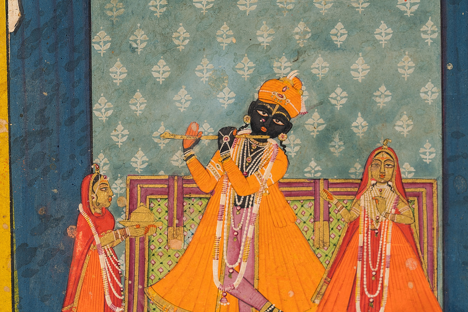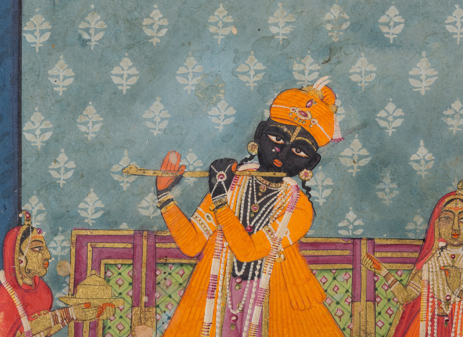 Lotto 495 | Arte Indiana Miniatura raffigurante Krishna che suona il flauto Pigmenti...