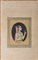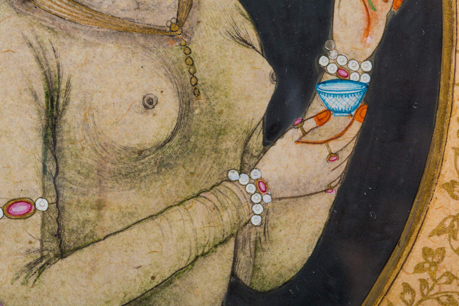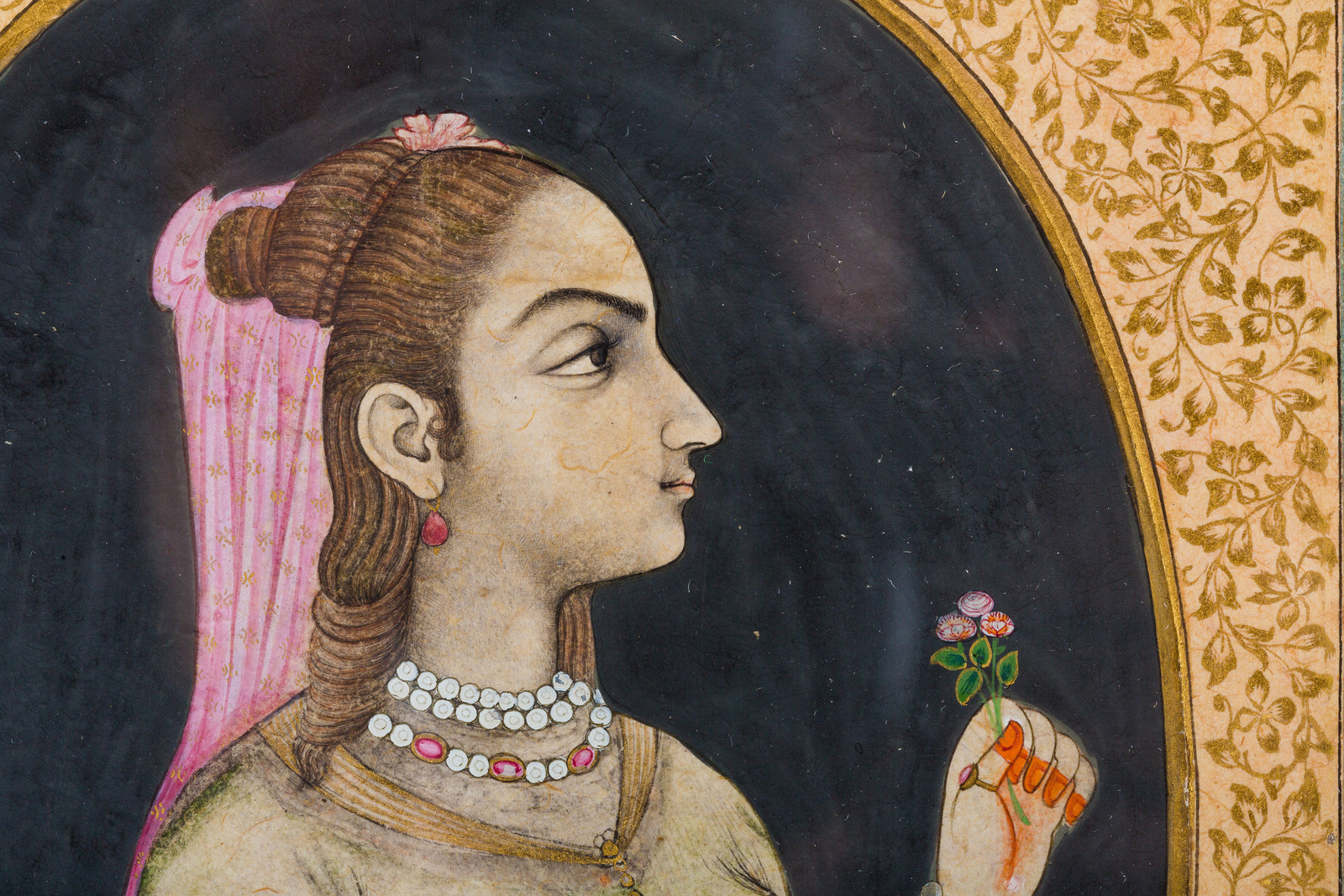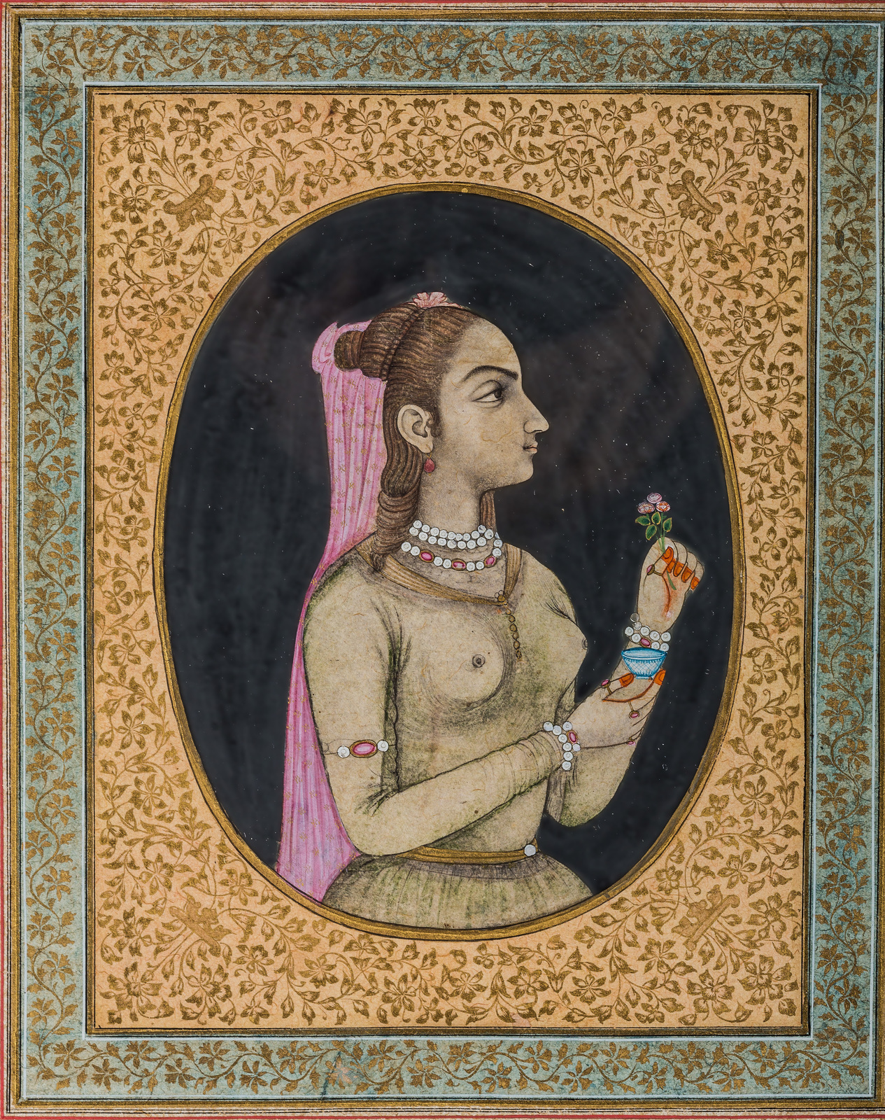 India, Moghul provinciale, seconda metà XVIII secolo . . Cm 27,50 x 42,50. Entro un medaglione ovale di derivazione Europea si staglia il profilo della nobildonna, abbellita con fili di perle ed henne sulle mani, regge in mano un fiore ed una coppa. Entro doppia cornice decorata con fiori dorati ed inserita su carta spolverata in oro. Cornice presente