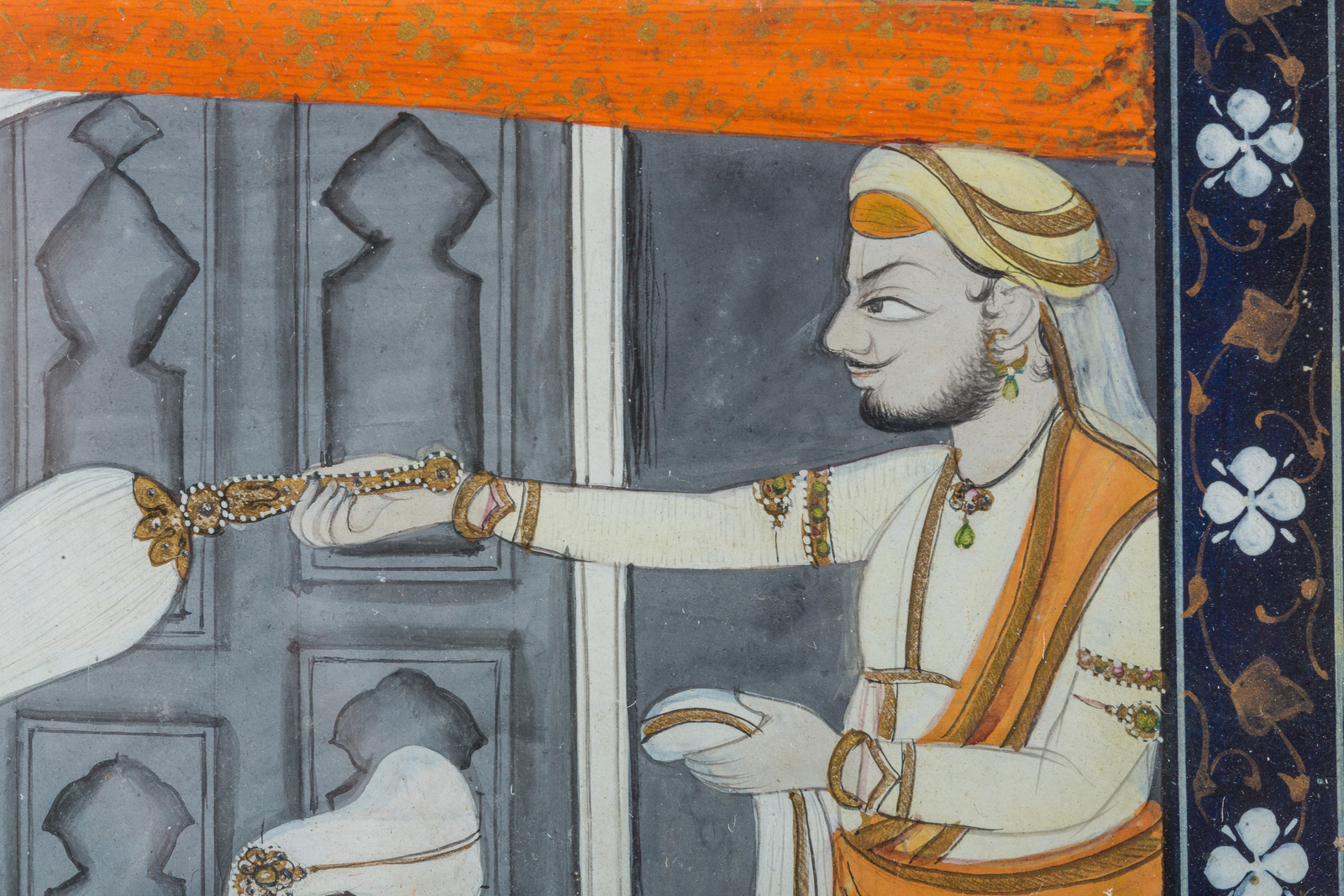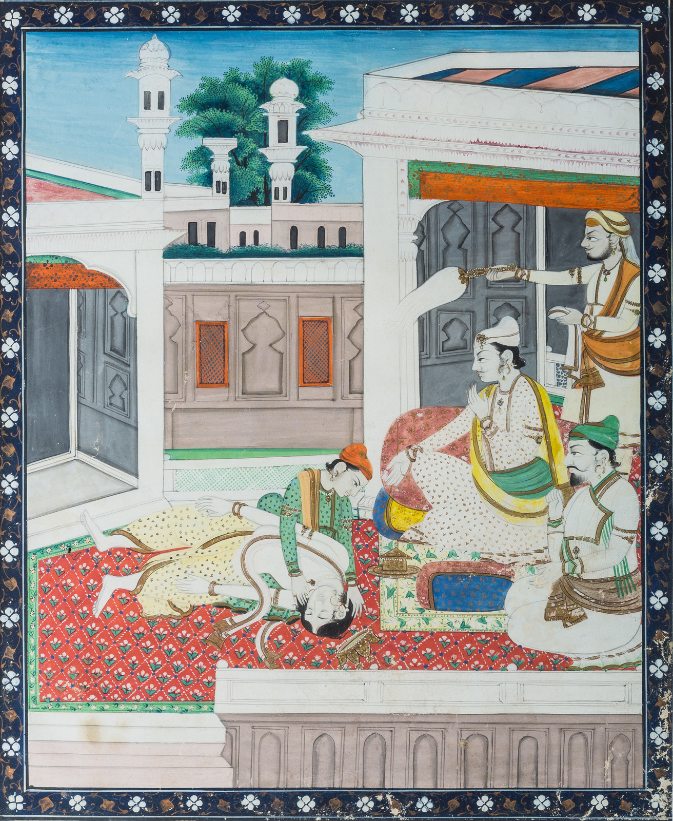 Arte Indiana Miniatura raffigurante lo svenimento di un re pigmenti ed oro su carta India, Punjab, Kangra, prima metà XIX secolo . . Cm 20,50 x 25,50. Nell'esterno di un contesto palatino è raffigurato un nobiluomo seduto su un tappeto floreale con un contenitore di foglie di pan, affiancato da due attendenti di cui uno con lo scaccia mosche, in udienza con un re che nello svenimento perde la corona e l'aiutante che se ne prende cura. La resa del contesto palaziale, l'espressione dei visi e la cornice sono elementi tipici della scuola di Kangra. Cornice presente