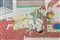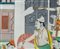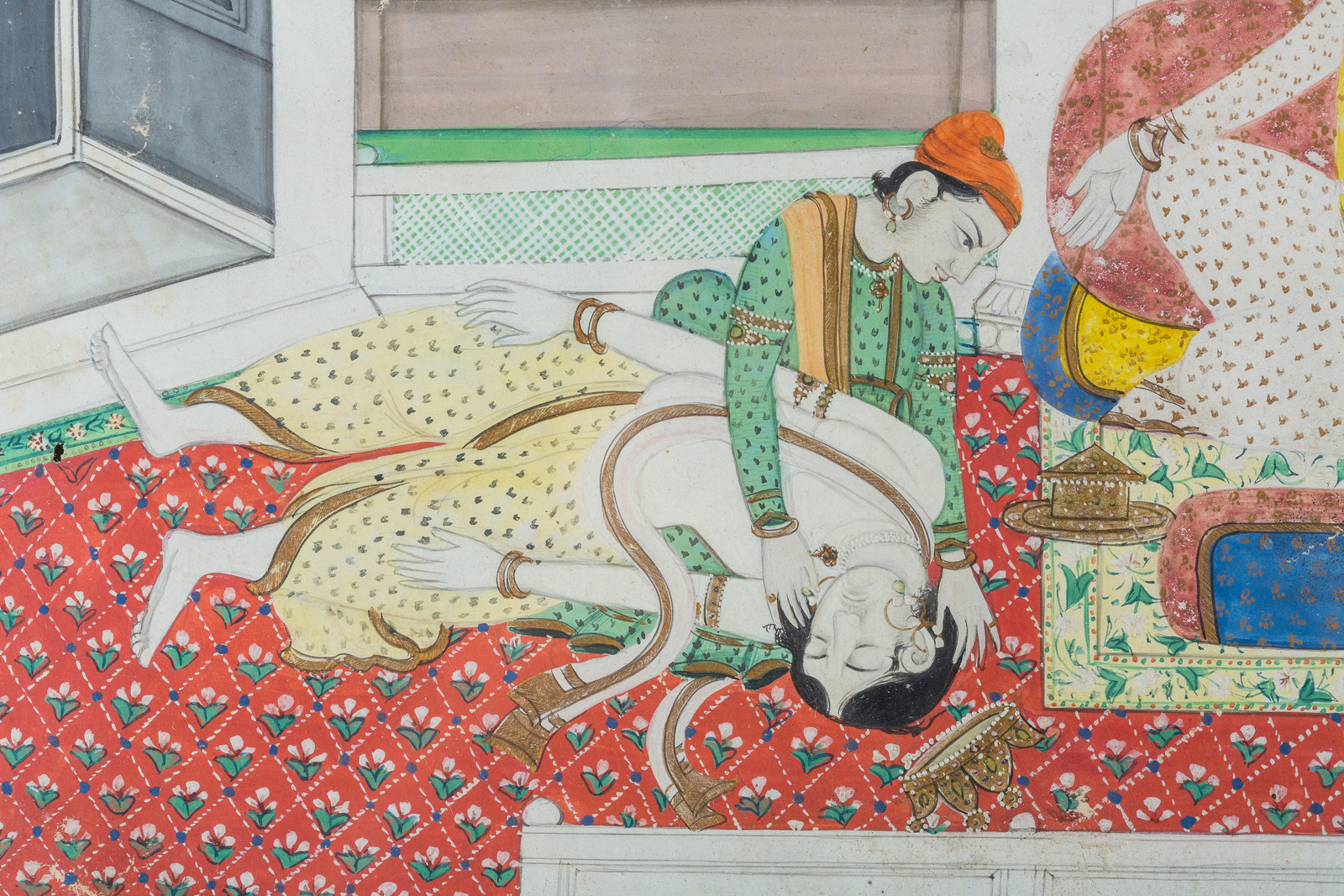Indian Art Painting depicting a fainted king Pigments and gold on paper India, Punjab hills, Kangra, first half 19th century . . Cm 20,50 x 25,50. Outside of a palace, a nobleman is depicted sitting on a floral carpet with a container of pan leaves, flanked by two servants. One of the servants is holding a fly-whisk. The nobleman is portrayed in the context of an audience with a king, who faints and loses the crown. A servant takes care of the monarch. The palatial setting, the look on the faces of the protagonists and the frame are all peculiar elements of the Kangra school. Cornice presente