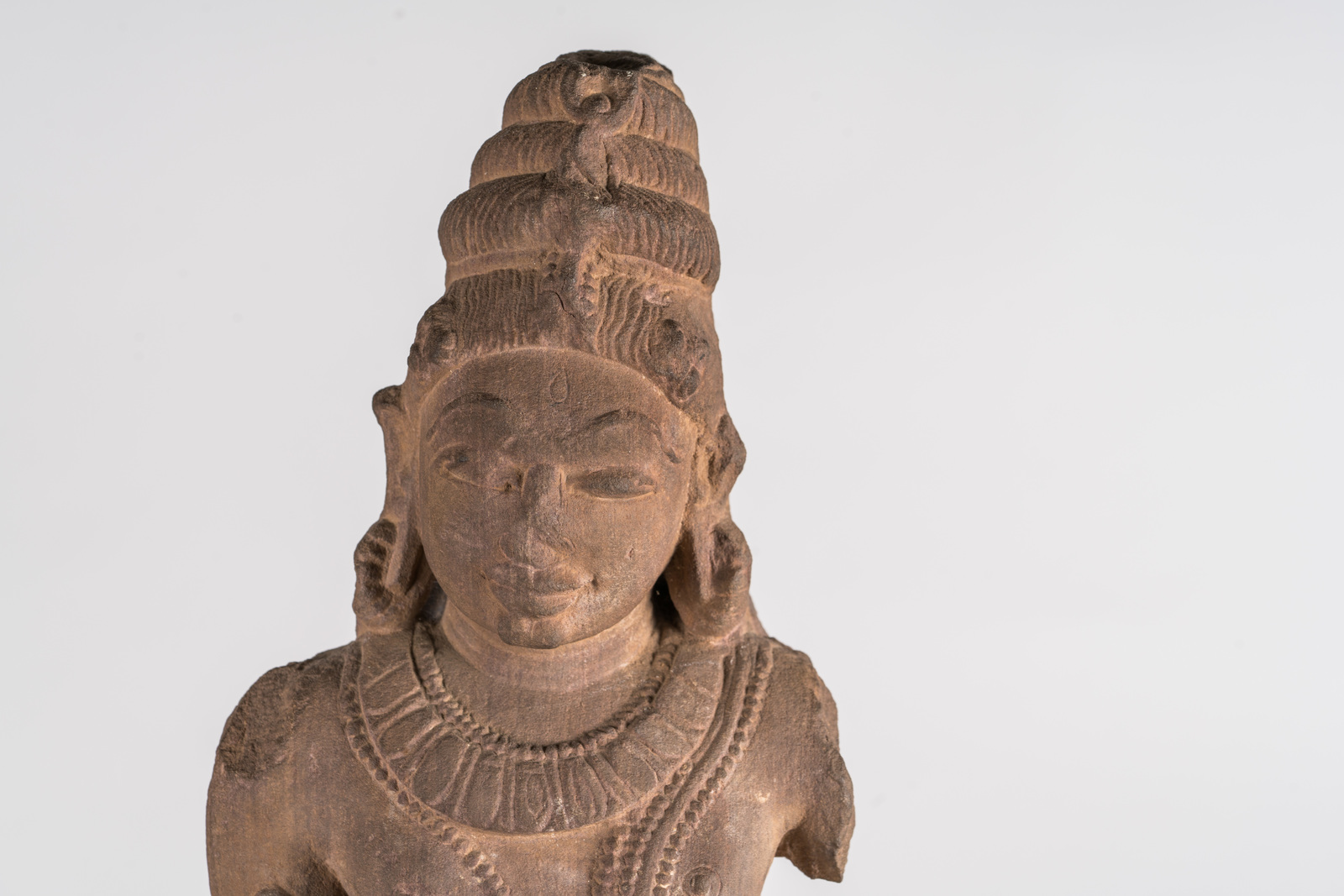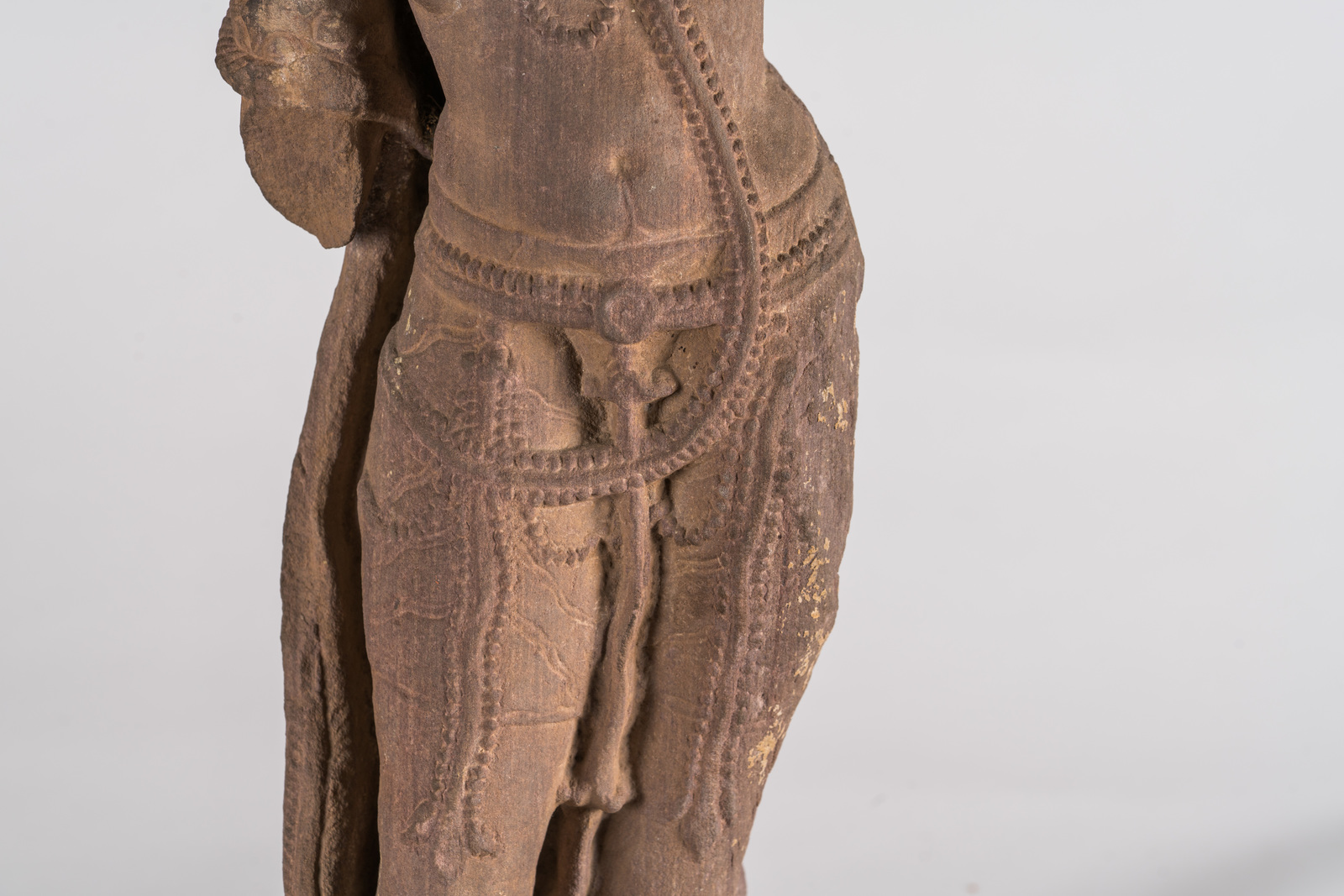 India, dinastia Chandella, Khajuraho, XI secolo . . Cm 14,00 x 63,00. Scultura raffigurante la divinità in postura tribanka, adornata con lunghe collane, peplo finemente decorato ed una complessa acconciatura a più livelli.