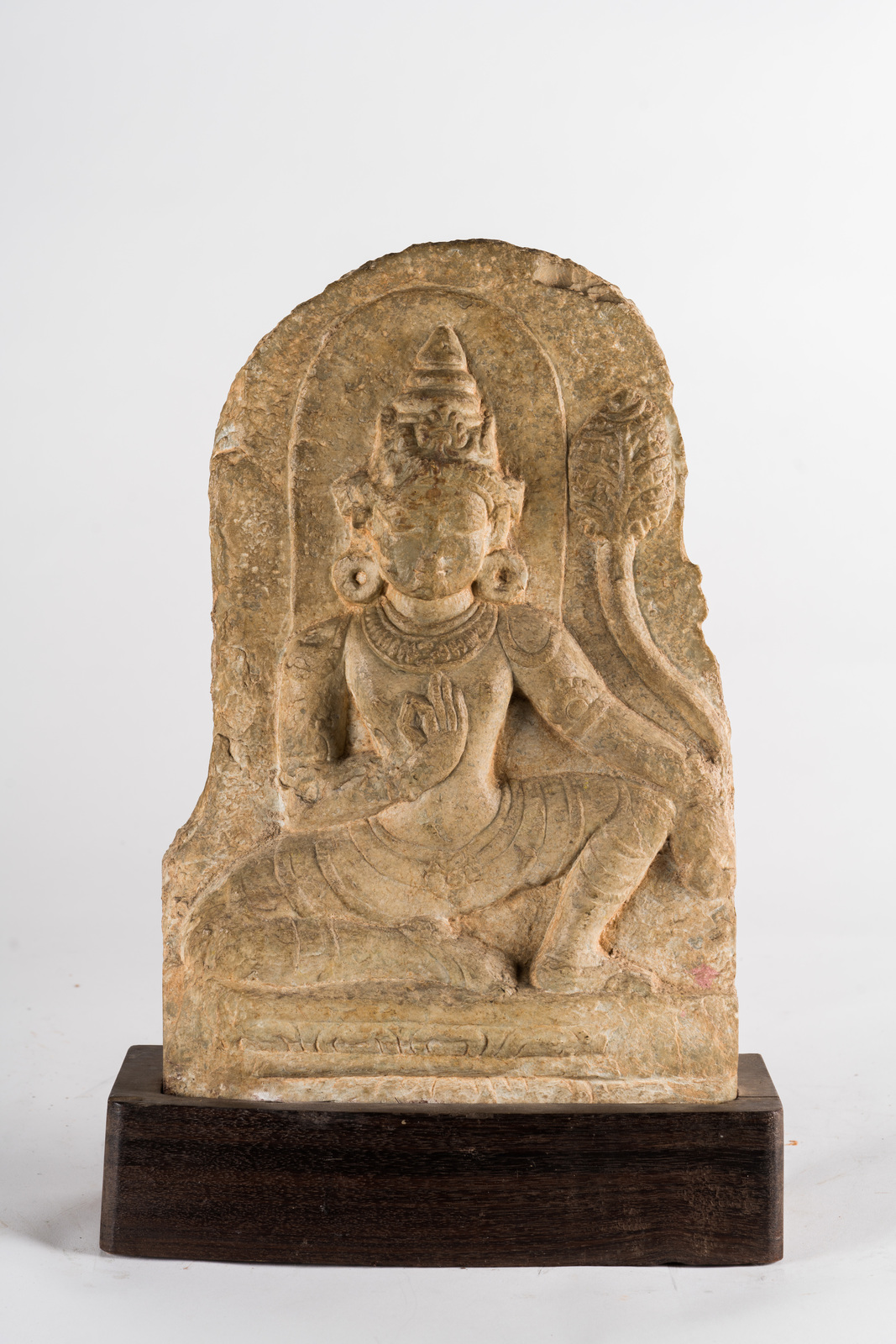 Arte Indiana Stele in marmo raffigurante un bodhisattva India, Andhra Pradesh, Amaravati, regno Satavahanai, II secolo d.C. . Cm 25,00 x 41,00. Stele raffigurante un bodhisattva o una Tara, seduto in posizione lilasana su una base a fiore di loto; la figura è adornata da una corona cuspide, grandi orecchini circolari e gioielli. La sua mano destra al petto, mentre la sinistra regge un tralcio che termina con una grande foglia o fiore di loto stilizzato.