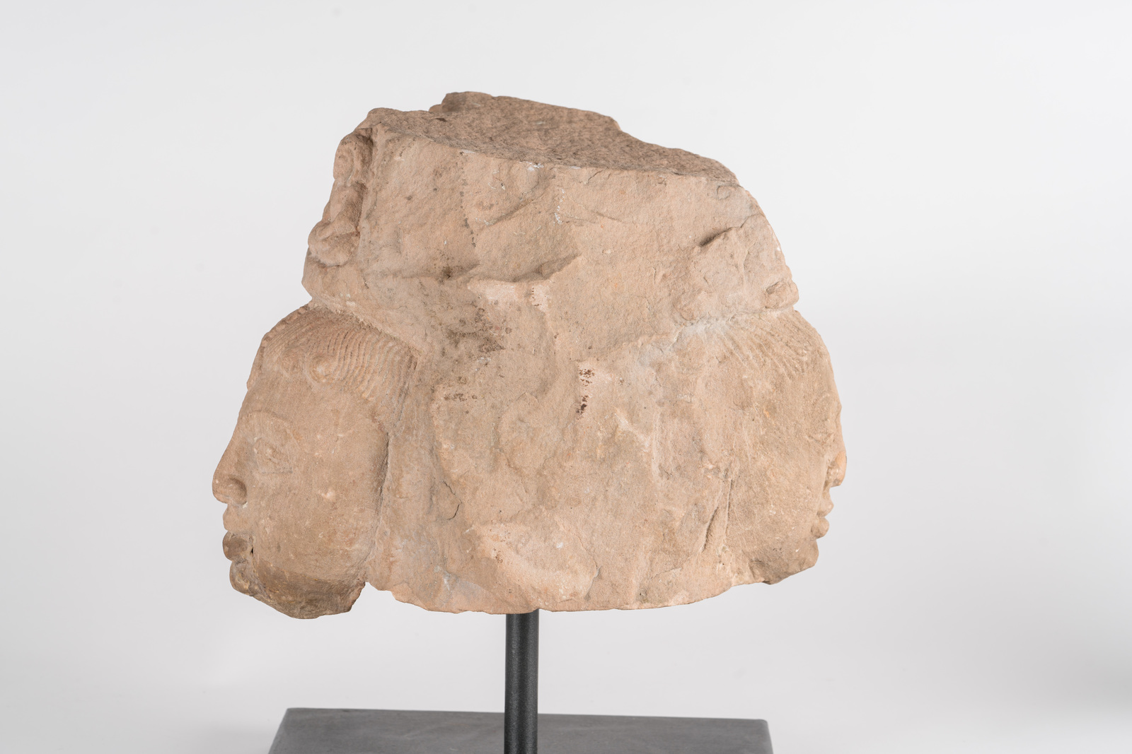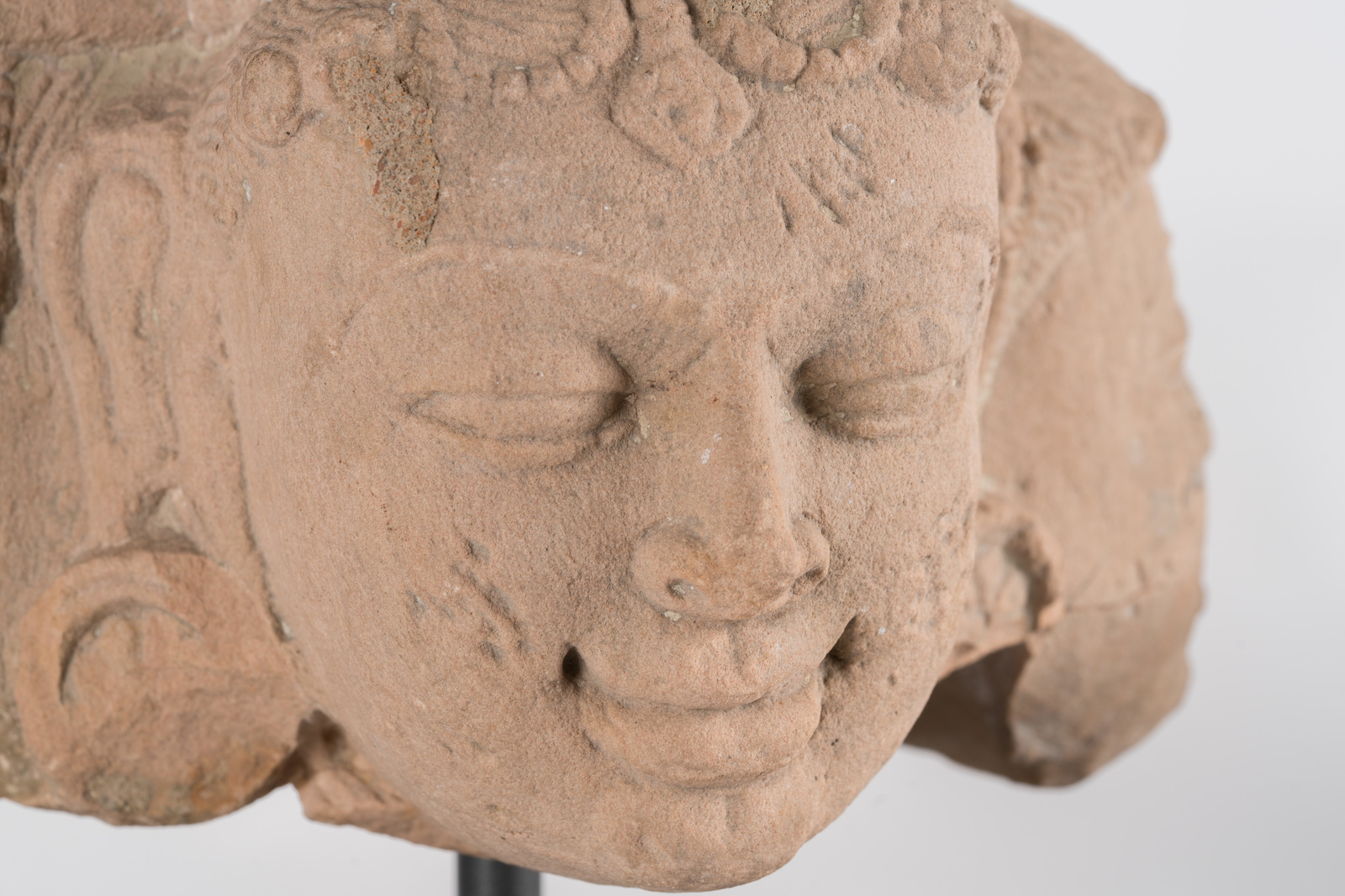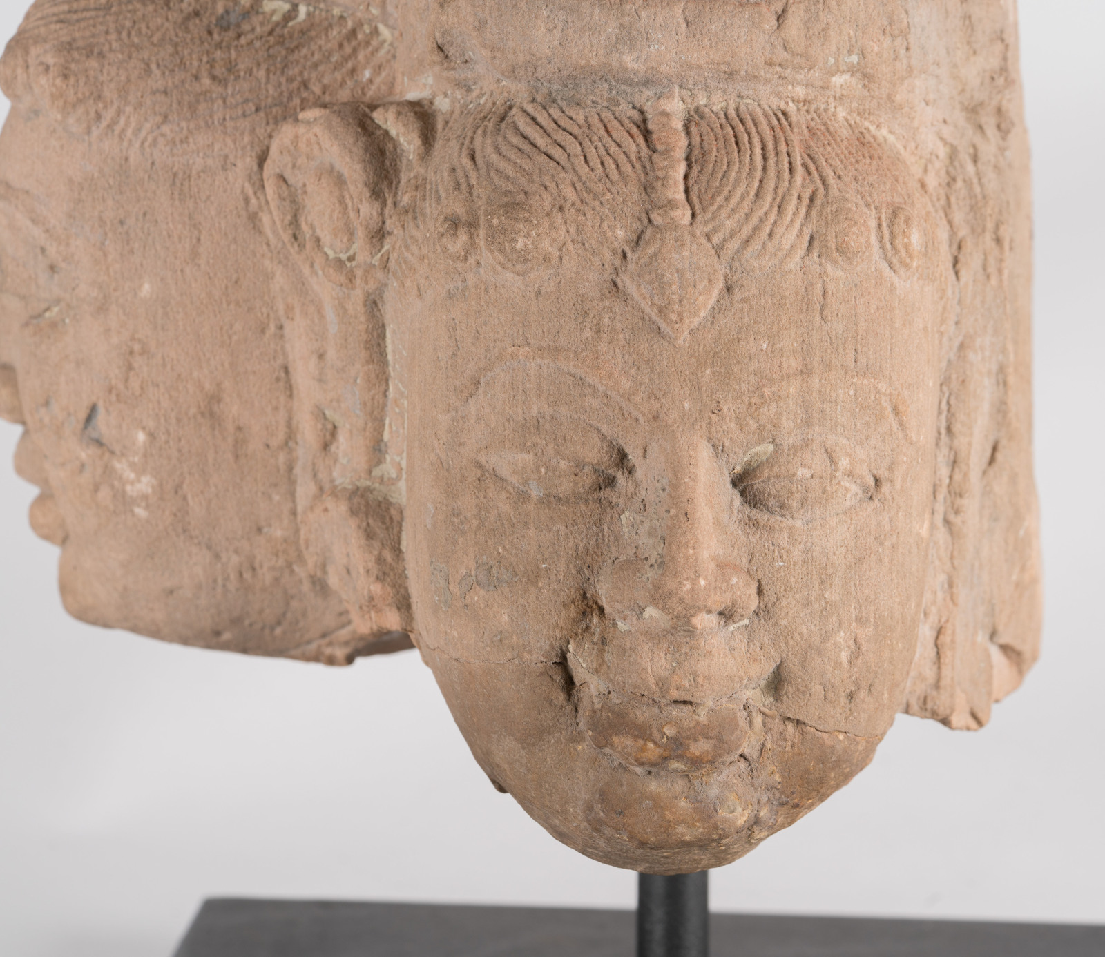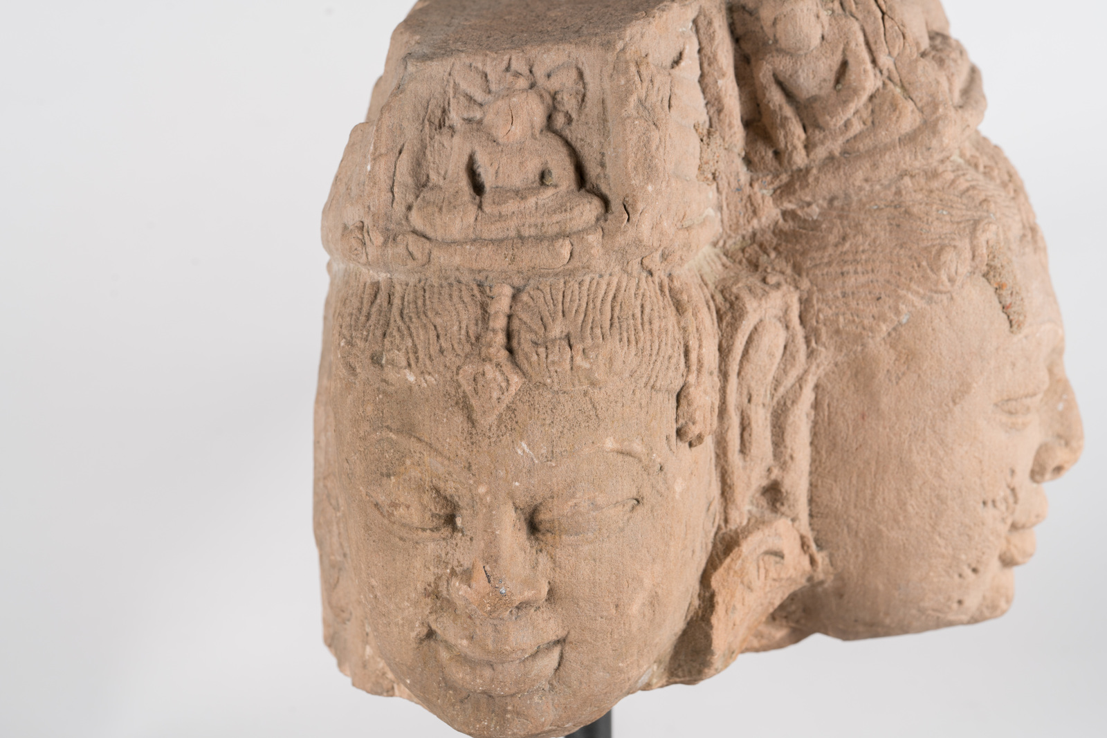 India settentrionale, probabilmente Uttar Pradesh, periodo Gupta, V secolo . -. Cm 25,00. Frammento di statua raffigurante una divinità a tre teste non meglio identificabile per la mancanza di attributi. Il volto principale mostra espressione serena, grandi orecchini circolari ed un elaborato e prezioso copricapo che ospita una piccola figura di Buddha che collocherebbe la scultura in ambito buddista.