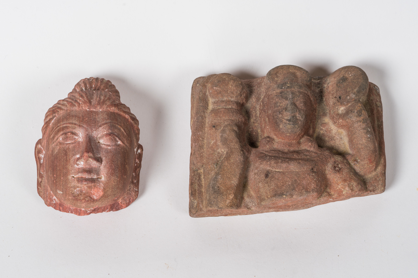 Arte Indiana Lotto composto da due frammenti di sculture in arenaria rossa: l'uno raffigurante Vishnu e l'altro raffigurante una testa con chignon