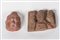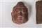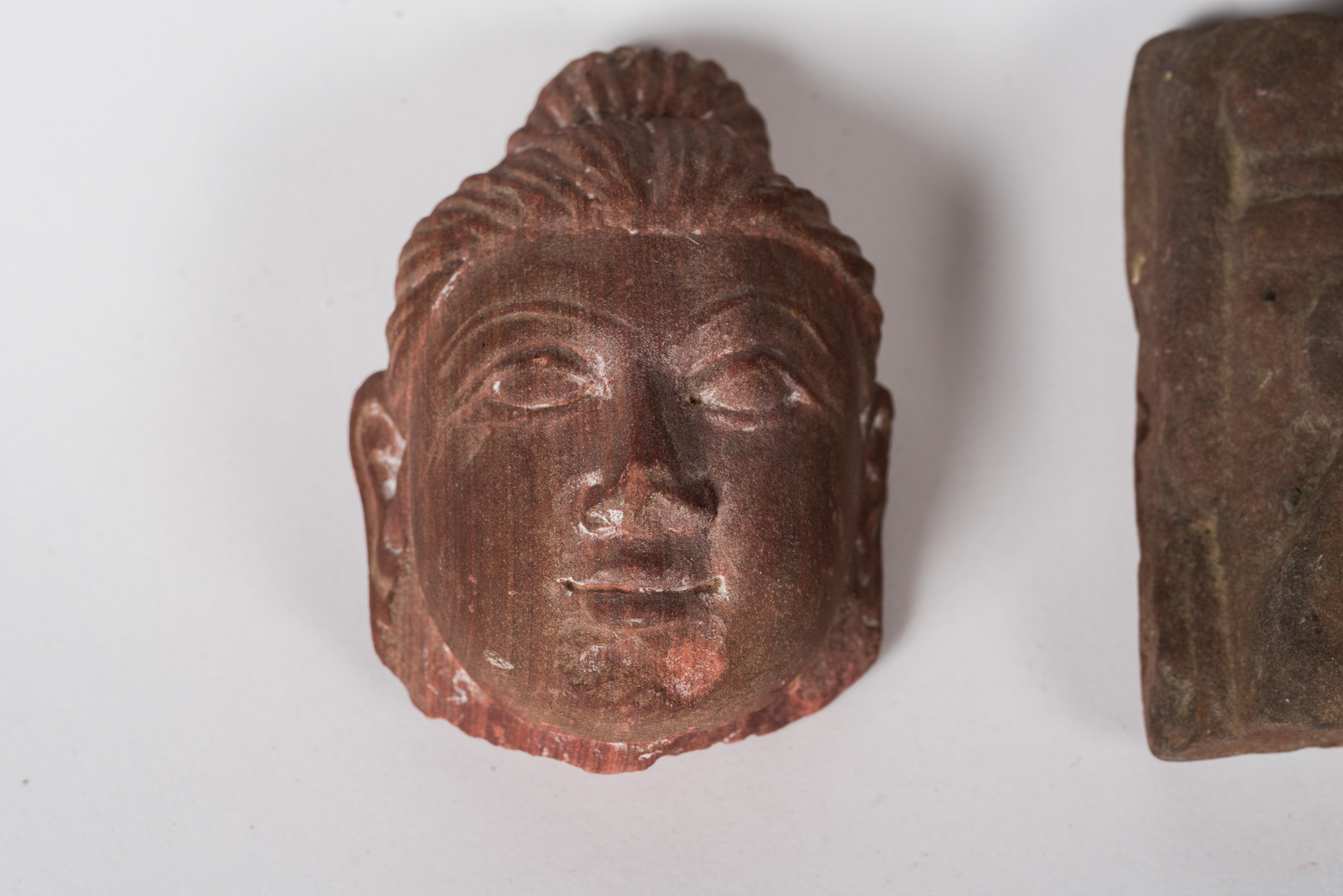 India settentrionale, stile Gupta . -. Cm 14,00 x 11,00. Frammento di piccola stele in arenaria rosa maculata raffigurante Vishnu riconoscibile dai due attributi: il disco e la mazza (14 X 11 cm); l'altro raffigurante una testa (10,5 X 7,2 cm).
