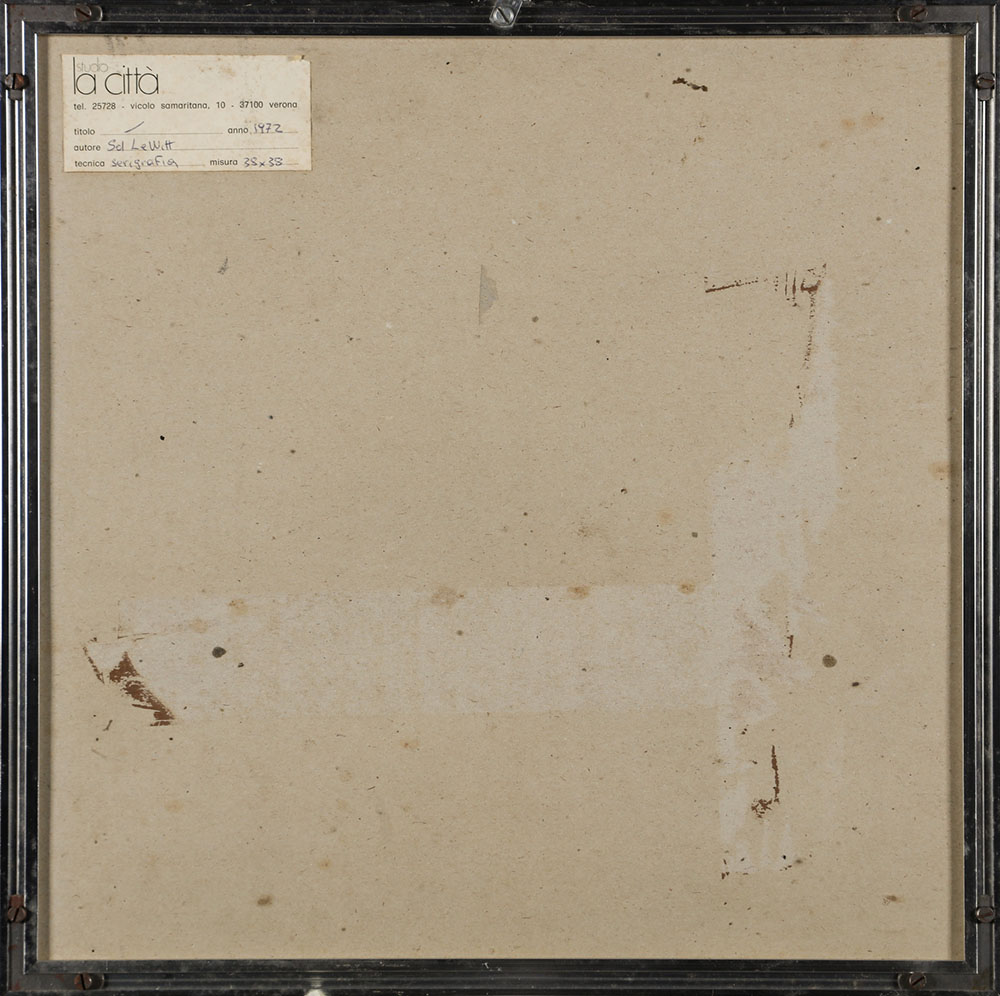 SOL LEWITT 1928 - 2007 Senza titolo, 1972 Multiplo serigrafia su carta, cm. 37,5 x 37,5 Opera n. 31/34 Edizioni Artestudio Macerata Firmato in basso a destra Timbro a secco Artestudio Macerata in basso a sinistra Etichetta Studio La Città, Verona sul retro Prov. Collezione Privata
