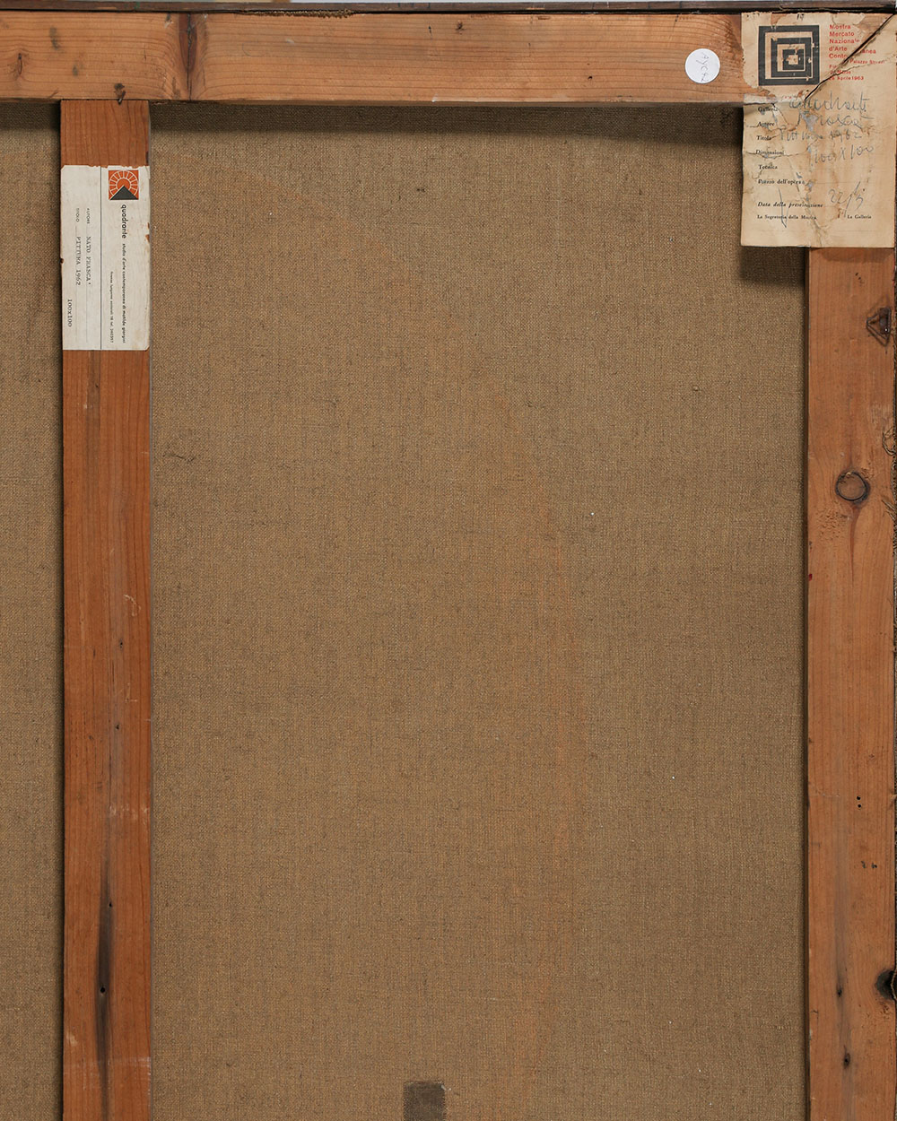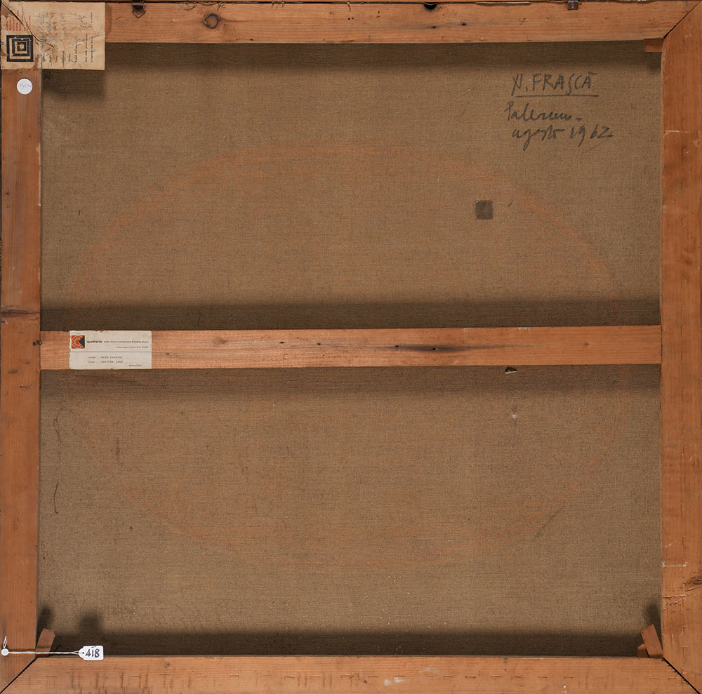 NATO FRASCA 1931 Senza titolo, 1962 Tecnica mista su tela, cm. 100 x 100 Firmato e datato sul retro Etichetta Quadrarte, Firenze sul retro Etichetta Mostra Mercato Nazionale d’Arte Contemporanea Palazzo Strozzi, Firenze sul retro L'opera presenta un piccolo restauro nella parte centrale ESPOSIZIONI: “Mostra Mercato Nazionale d’Arte Contemporanea”, Palazzo Strozzi Firenze, 23 marzo – 28 aprile 1963 Prov. Collezione Privata