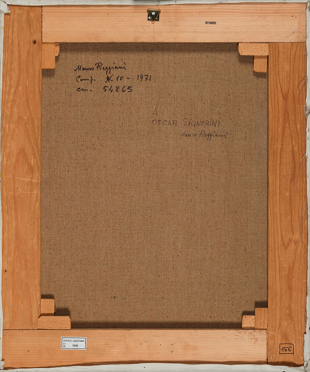 MAURO REGGIANI 1897 - 1980 Comp. N – 10, 1971 Tecnica mista su tela, cm. 65 x 54 Firmato e datato sul retro Dedica dell’artista a Oscar Signorini sul retro Timbro D’Ars, Milano sul retro Prov. Collezione Fondazione D’Ars Oscar Signorini Onlus, Milano