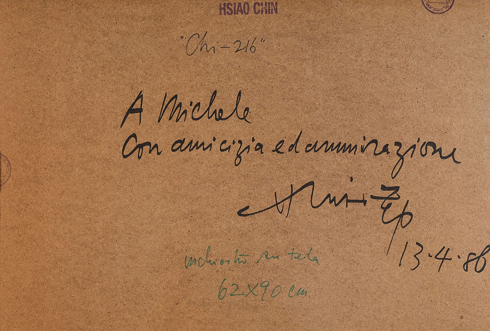 HSIAO CHIN 1935 Chi – 216, 1983 Inchiostro su tela, cm. 61 x 90,5 Firmato in basso a destra Timbro dell’artista sul retro Dedica dell’artista sul retro Autentica dell’artista su fotografia Prov. Collezione Privata