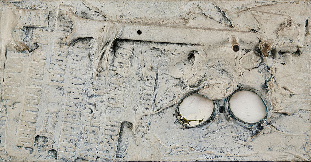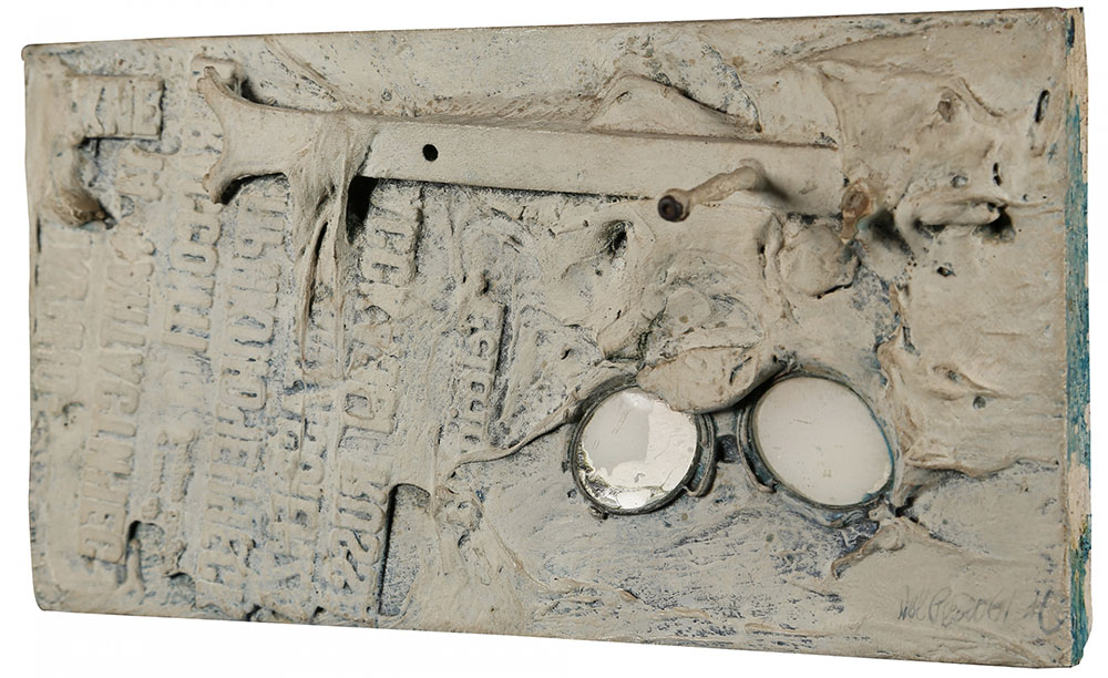 LUCIO DEL PEZZO 1933 Gli occhi del ricordo, 1961 Polimaterico su tavola, cm. 15,5 x 29,5 x 6 Firmato e datato in basso a destra Etichetta Galleria Schwarz, Milano sul retro Certificato di Autenticità a cura della Galleria d’Arte Niccoli, su fotografia Prov. Collezione Privata