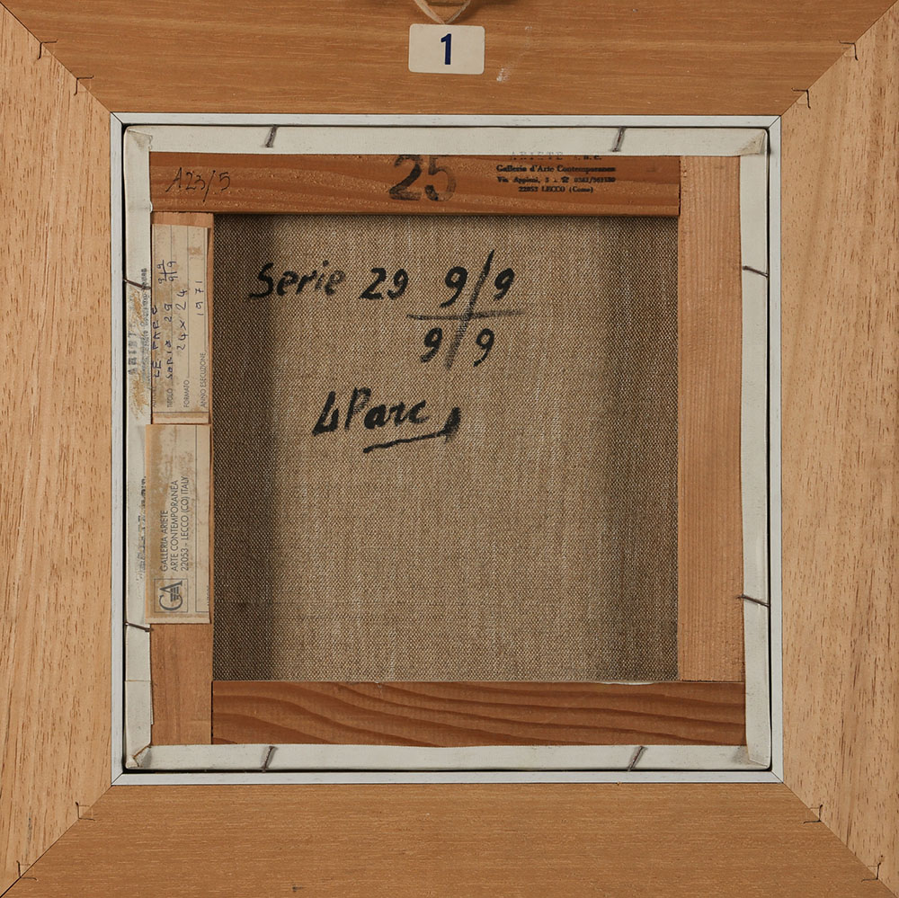 JULIO LE PARC 1928 Serie 29 9/9 – 9/9, 1971 Acrilico su tela, cm. 25,5 x 25,5 Firmato in basso a destra Etichetta e Timbro Galleria Ariete Arte Contemporanea, Lecco sul retro Certificato di Provenienza Nuova Brerarte S.p.a. Prov. Nuova Brerarte S.p.a. Prov. Collezione Privata