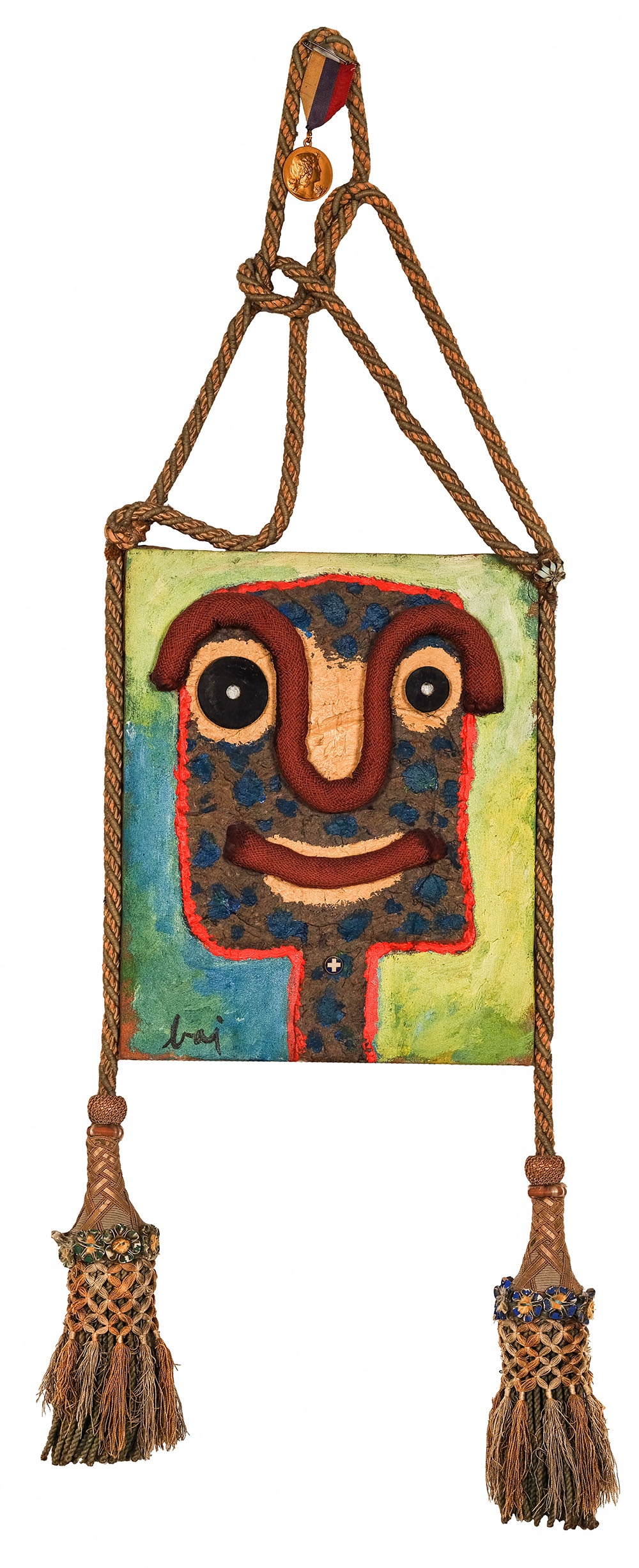 ENRICO BAJ 1924 - 2003 Piccolo personaggio, 1962 Olio e collage su tela, assemblaggio di corda, tappezzeria, medaglia, nappe, ovatta, cm. 89 x 33 (tela cm. 29,5 x 24,5) Firmato in basso a sinistra Roberta Cerini Baj ha confermato l’autenticità Timbro D’Ars, Milano sul retro ESPOSIZIONI: “Il dubbio. Luogo della ricerca”, Castell’Arquato, Antico Palazzo della Pretura, 2002 PUBBLICAZIONI: “Baj, Catalogo generale delle opere dal 1996 al 2003”, Editori Marconi-Menhir, 1997, sezione addenda p. 241 tavola 707.A Prov. Collezione Fondazione D’Ars Oscar Signorini Onlus, Milano
