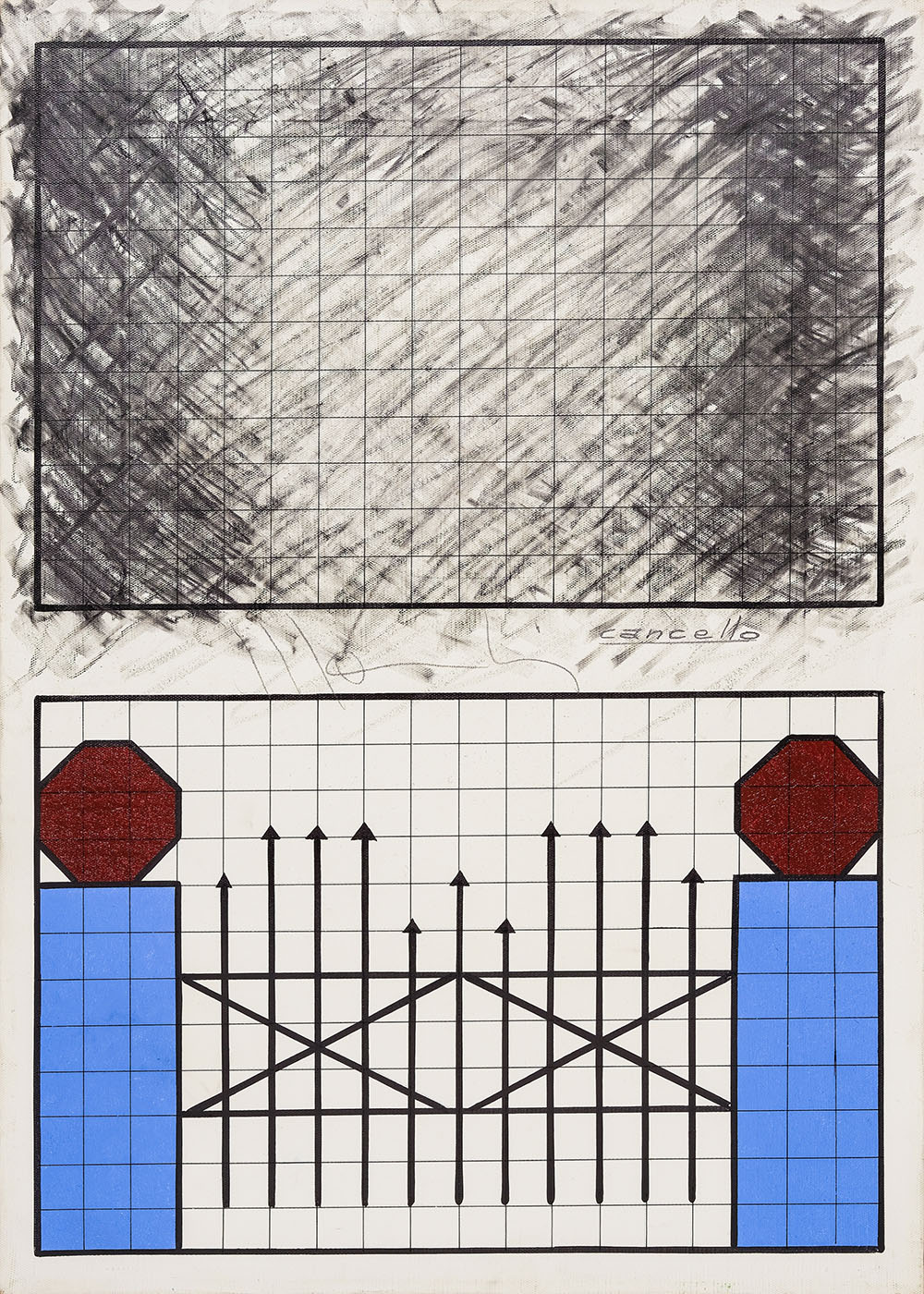 ALDO MONDINO 1938 - 2005 Cancello, anni ‘60/'70 Tecnica mista su tela, cm. 70 x 50 Firmato al centro Timbro Fondazione D’Ars Oscar Signorini Onlus, Milano sul retro Timbro D’Ars, Milano sul retro Opera in fase di archiviazione presso l’Archivio Aldo Mondino Prov. Collezione Fondazione D’Ars Oscar Signorini Onlus, Milano