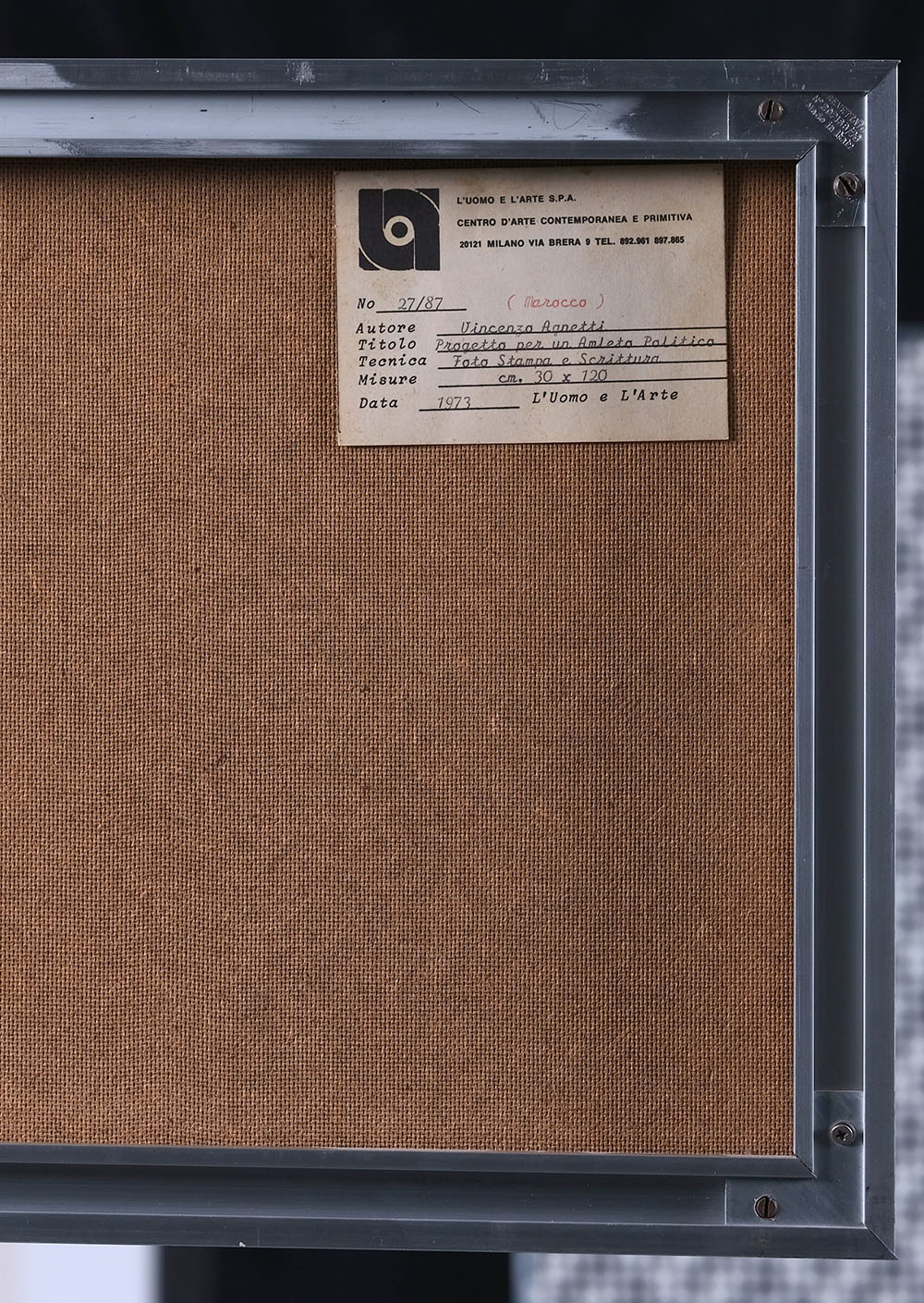 VINCENZO AGNETTI 1926 - 1981 Progetto per un Amleto politico, bandiera (Marocco), 1973 Fotografia e testo stampato montati su lastra di alluminio, cm. 30 x 120 Firmato e datato Etichetta L’Uomo e L’Arte S.p.a., Centro d’Arte Contemporanea e Primitiva, Milano sul retro Certificato di Autenticità a cura dell’Archivio Vincenzo Agnetti Prov. Galleria l’Uomo e l’Arte, Milano Prov. Collezione Privata