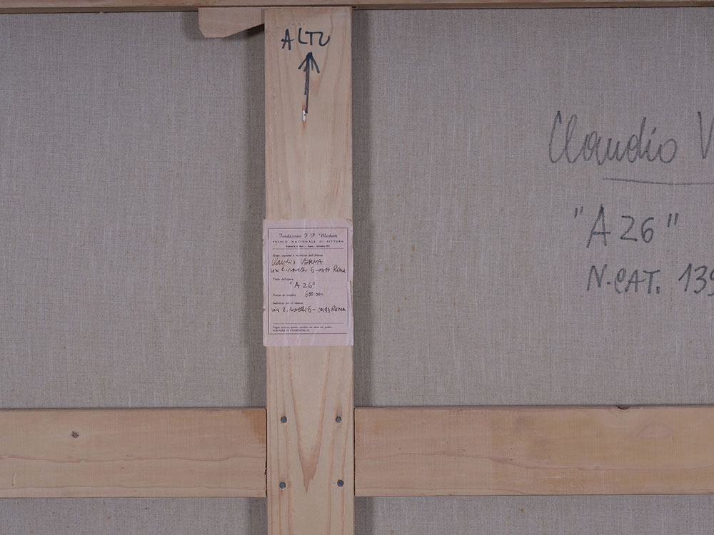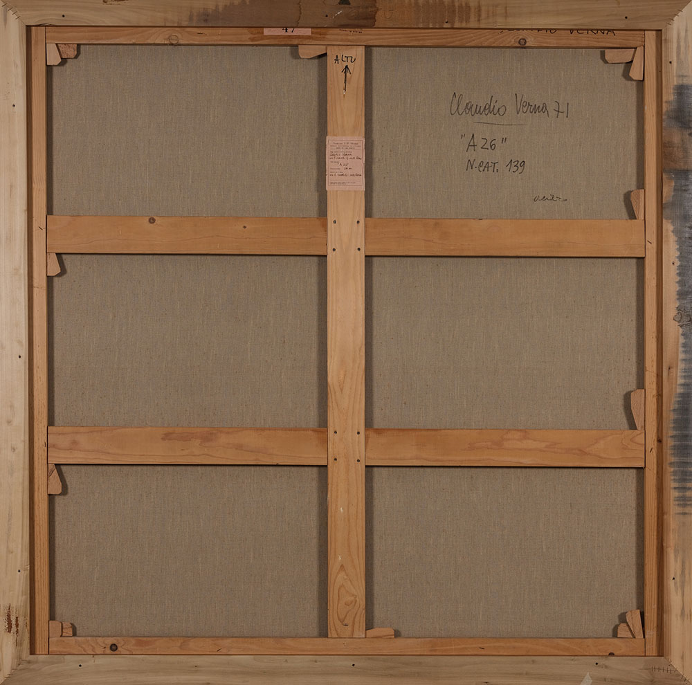 CLAUDIO VERNA 1937 A 26, 1971 Acrilico su tela, cm. 150 x 150 Firmato e datato sul retro Etichetta Fondazione F. P. Michetti, Premio Nazionale di Pittura, 1971 sul retro Certificato di Autenticità dell’Archivio Claudio Verna ESPOSIZIONI: “Premio Michetti”, Francavilla al mare 1971 Mostra personale, Galleria Editalia, Roma 1971 Mostra personale, Galleria del Milione, Milano 1973 PUBBLICAZIONI: “Pittura Analitica”, Fondazione VAF, Silvana Editoriale, Cinisello Balsamo 2008, p. 200 “Claudio Verna catalogo ragionato”, a cura di Daniela Ferrari, Fondazione VAF, Silvana Editoriale, Cinisello Balsamo 2010, p. 306 ill.139 “VAF Stiftung La Collezione/The Collection/Die Sammlung”, Fondazione VAF, Silvana Editoriale, Cinisello Balsamo 2012, p. 715 Prov. Galleria Fumagalli, Bergamo Prov. Collezione Vaf Stiftung, Francoforte sul Meno Prov. MART, Rovereto Prov. Collezione Privata