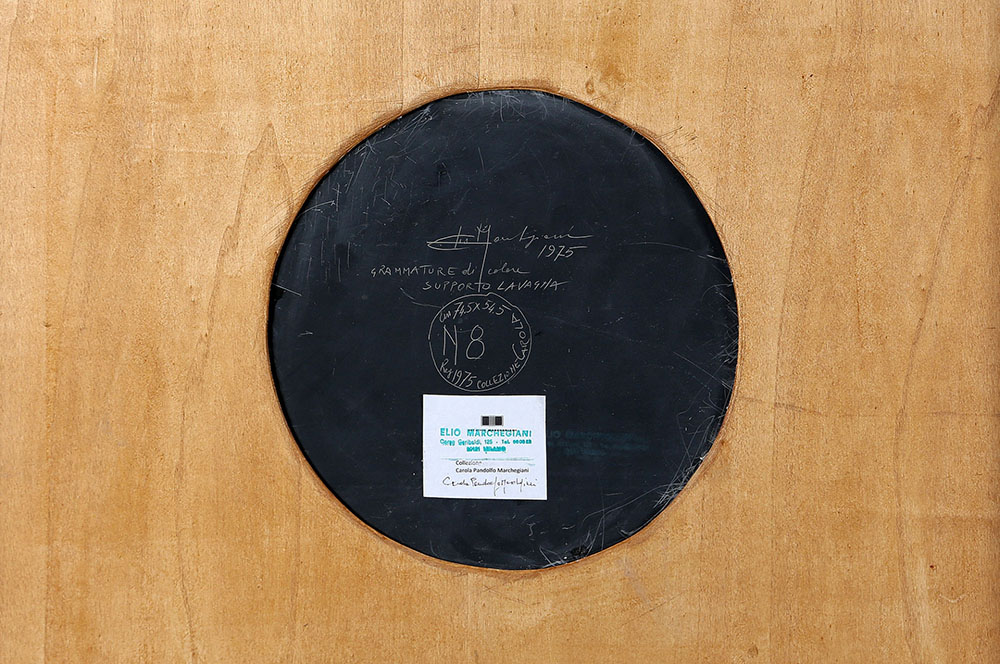 ELIO MARCHEGIANI 1929 Grammature di colore, 1975 Grammature di colore su lavagna nera, cm. 54,5 x 74,5 Firmato e datato sul retro Etichetta dell'artista sul retro Autentica dell'artista su fotografia Prov. Collezione Privata