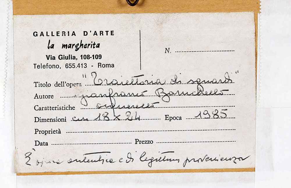 GIANFRANCO BARUCHELLO 1924 Traiettoria di sguardi, 1985 Acquerello e grafite su carta, cm. 18 x 24 Siglato e datato in basso al centro Etichetta Galleria d’Arte la Margherita, Roma sul retro Prov. Collezione Privata