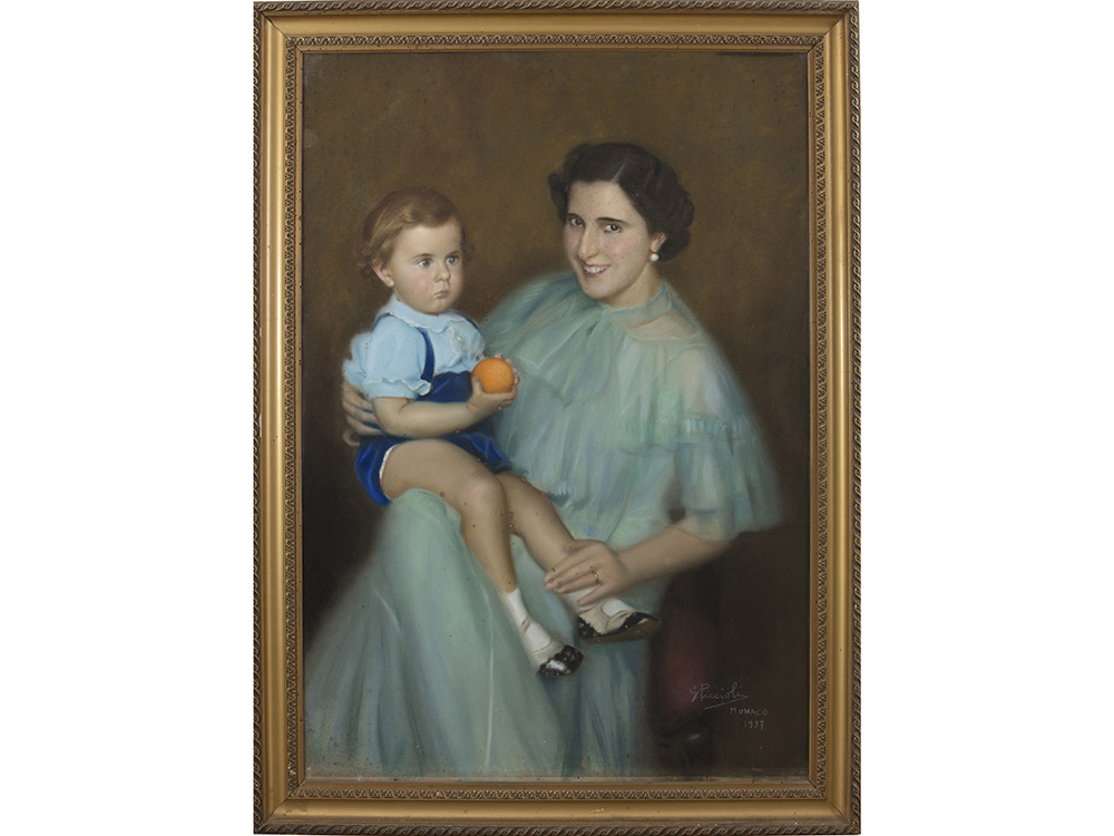 G.Piccioli (XX secolo), Pastello su carta,Madre e figlia con arancia 105x74 cm