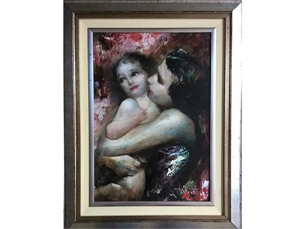 Mario Pobbiati (1887-1956), Olio su compensato,Madre con figlia 50x35 cm