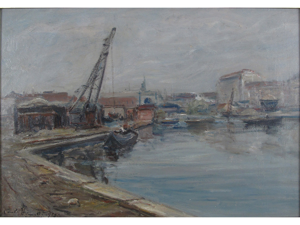 Carlo Aimetti (1901-1980), Olio su compensato,Darsena 45x65 cm