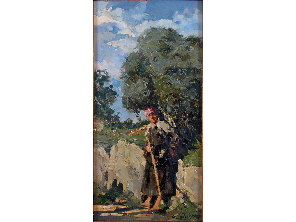 Alfredo Scocchera (1887–1954), Olio su tavoletta,Paesaggio con contadinella 37x18 cm