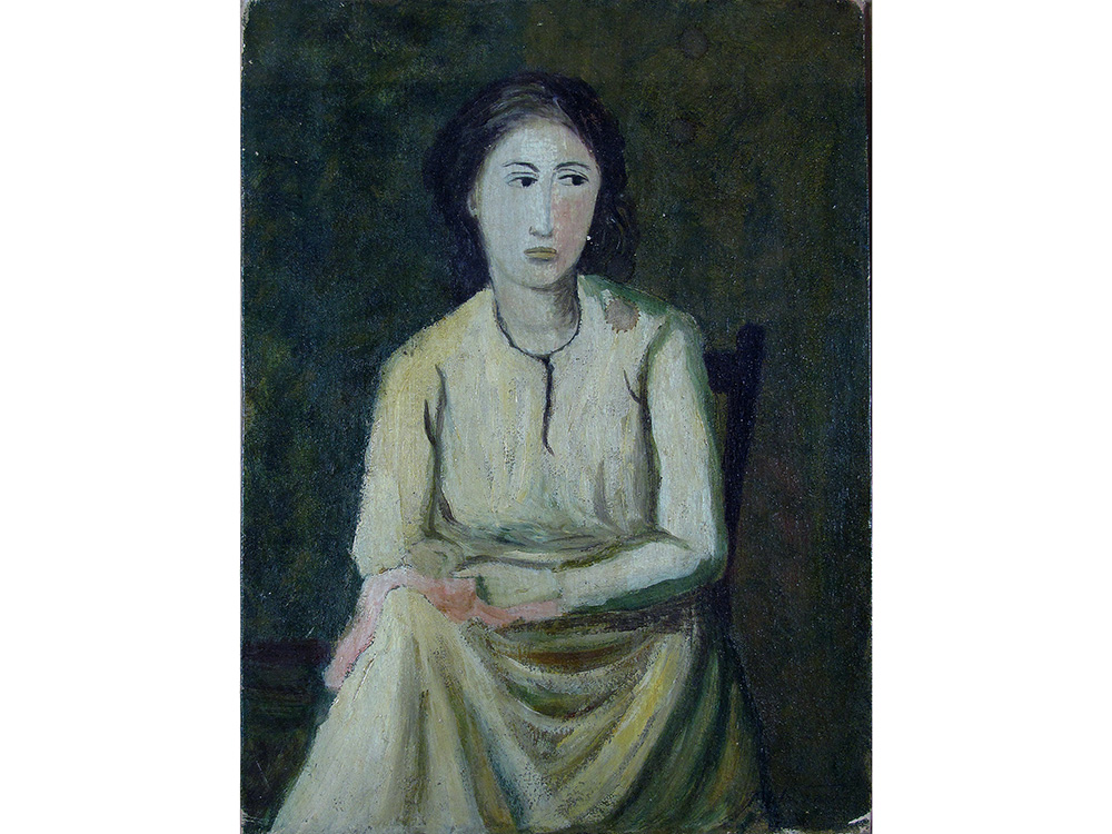 R.Vaccari (XX secolo), Olio su cartone telato,Sulla seggiola 36x26 cm
