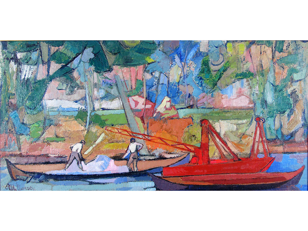 Otello Bernardi (1907-1981), Olio su tela,Draghe e uomini 44x90 cm
