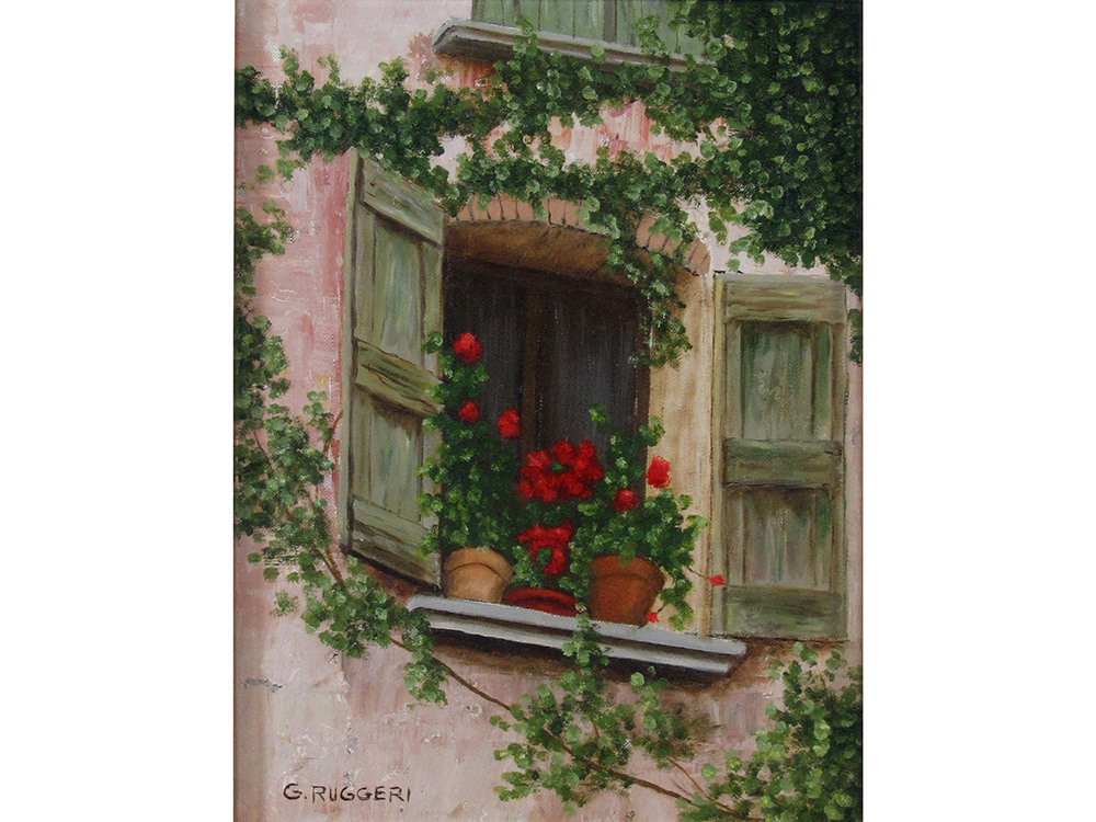 Giulio Ruggeri (XX secolo), Olio su tela,Finestra con gerani 34x28 cm