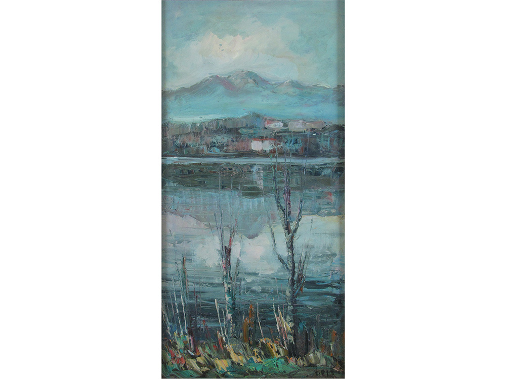 Aldo Oppici (1908 - 1985), Olio su tela,Paesaggio lacustre 58x28,5 cm