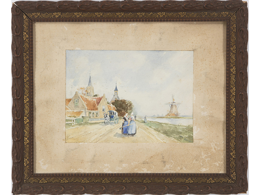 Firma illeggibile (XX secolo), Acquarello su carta,Paesaggio olandese con figure 17,5x24 cm