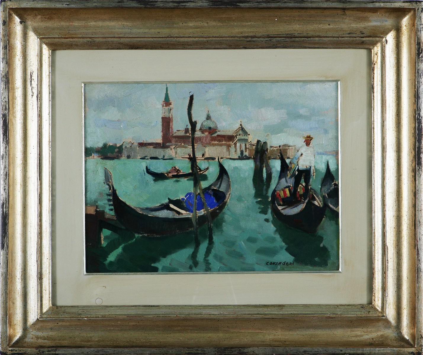 CONSADORI SILVIO (1909 - 1994) Venezia 80. Olio su cartone telato, cm 40x30,5. Firma in basso a destra. Al retro firma e titolo. Cornice presente.
