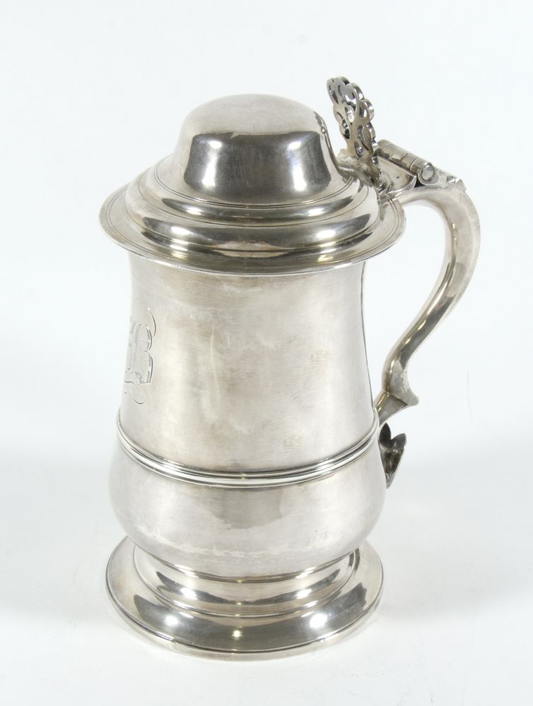 Tankard in argento su corpo svasato con nervatura centrale, manico a doppia voluta. Londra 1788. H. cm. 20. gr. 750.