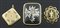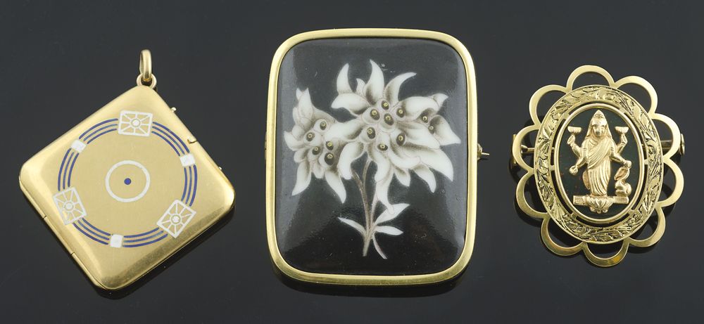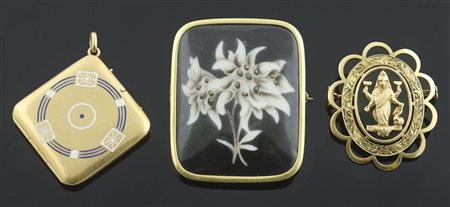 Lotto composto da una spilla con dipinta una stella alpina su porcellana con cornice in oro giallo, una spilla oro giallo con al centro sbalzo divinità orientale e ciondolo portafoto in oro decorata a smalti