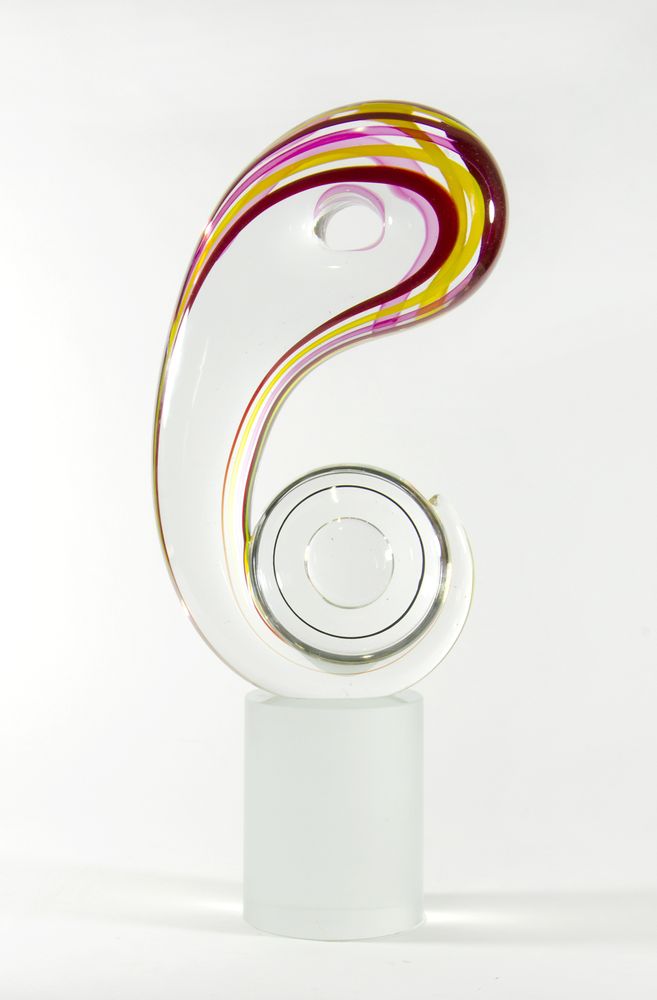 Scultura in vetro policromo su base circolare. Timbro sotto la base Bisazza...