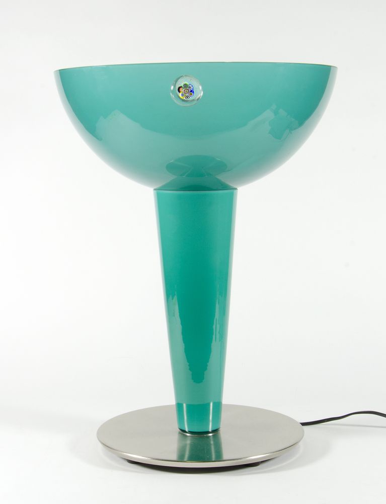 Lotto 349 | Lampada da tavolo in vetro verde con montatura in metallo cromato. H. cm. 54.