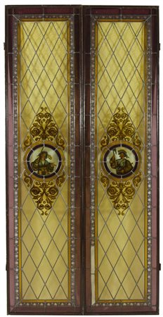 Coppia di vetrate piombate raffiguranti cavalieri. Firmate Gianina Torino. cm. 172x40. (difetti).