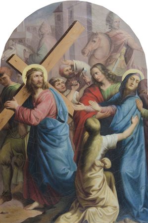 Maestro del XIX secolo "Episodio della Via Crucis" cm. 80x54 - olio su tela foderata (taglio a lunetta)