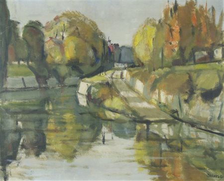 Nikolaj Omersa 1911-1981 "Autunno sul fiume" cm. 65x80 - olio su tela Firmato...