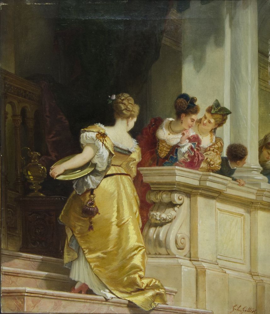 Lorenzo Giuseppe Gatteri Trieste 1829-1884 "Amiche a Palazzo" cm. 42x35 - olio su tela Firmato b. a d. e datato 1875.