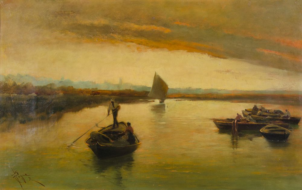 Giuseppe Pogna Trieste 1845-1907 "Pescatore al tramonto" cm. 39x61 - olio su tela Firmato b. a s.