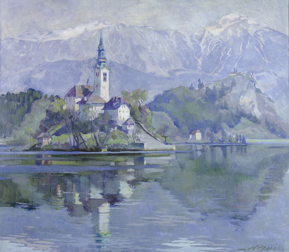 Joze Bunic "Neve a Bled" cm. 76x86 - olio su tela Firmato b. a d.