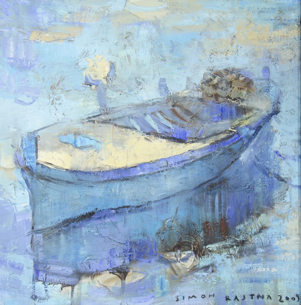 Simon Kajtna "Barca azzurra" cm. 40x40 - olio su tela Firmato b. a d. e datato 2009.
