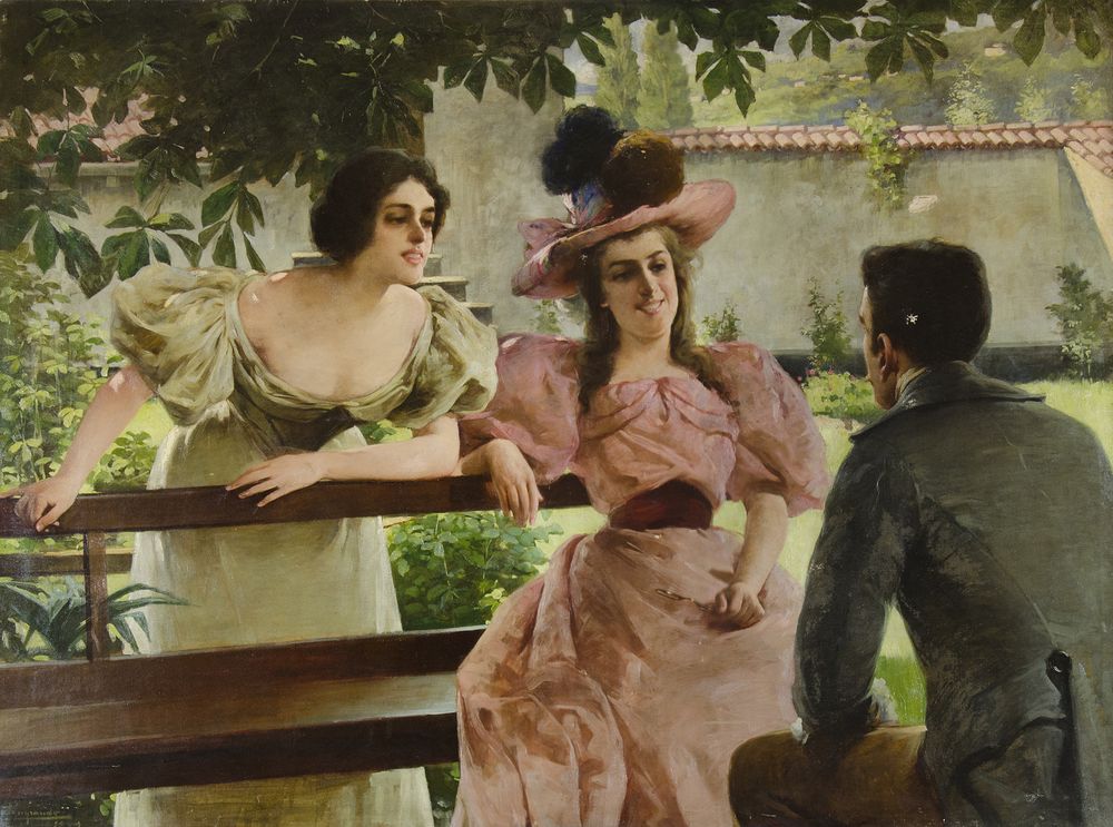 Giovanni Zangrando Trieste 1867-1941 "Chiacchiere in giardino" cm. 120x160 - olio su tela (rotture e mancanze) Firmato b. a s. e datato (18) 96.