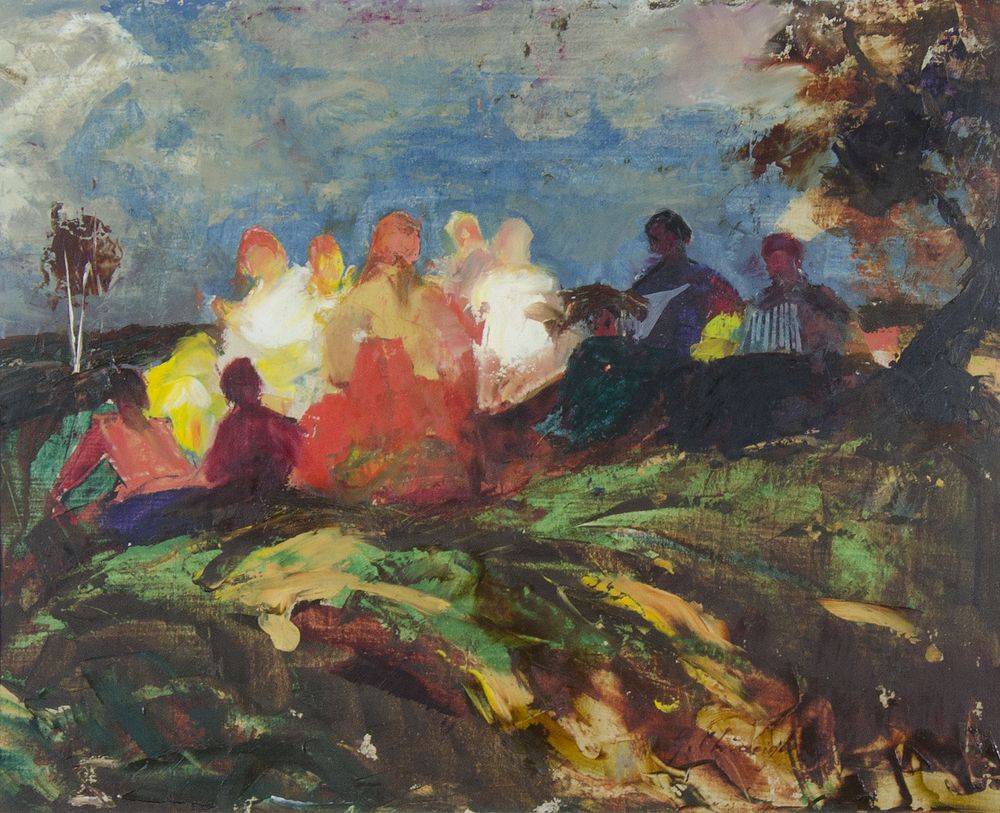 Giuseppe Chiacigh Wladikawkaz 1895-Trieste 1967 "Attorno al fuoco" cm. 40x50 - olio su compensato Firmato b. a d.