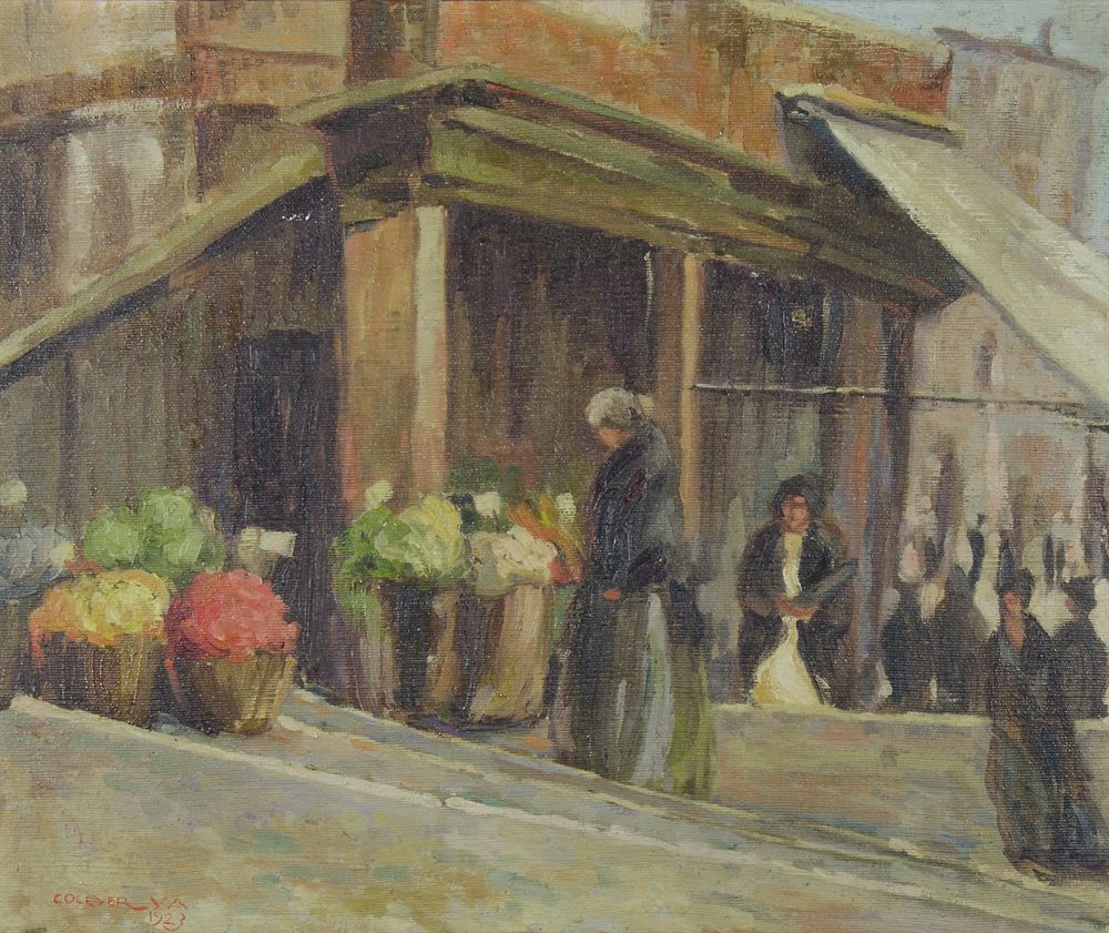 Vittorio Cocever Capodistria 1902-1971 "Mercato S. Apostoli a Venezia" cm. 50x60 - olio su tela Firmato b. a s. Al retro etichetta Prima esposizione istriana d'arte, Pola 1923.