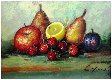GIO BATTA LEPORI Livorno 1911 – Livorno 2002 Frutta Olio su faesite 23 x 32. Firma in b. a d.; sul verso etichetta studio dell’artista + firma e titolo. B.A.: 50