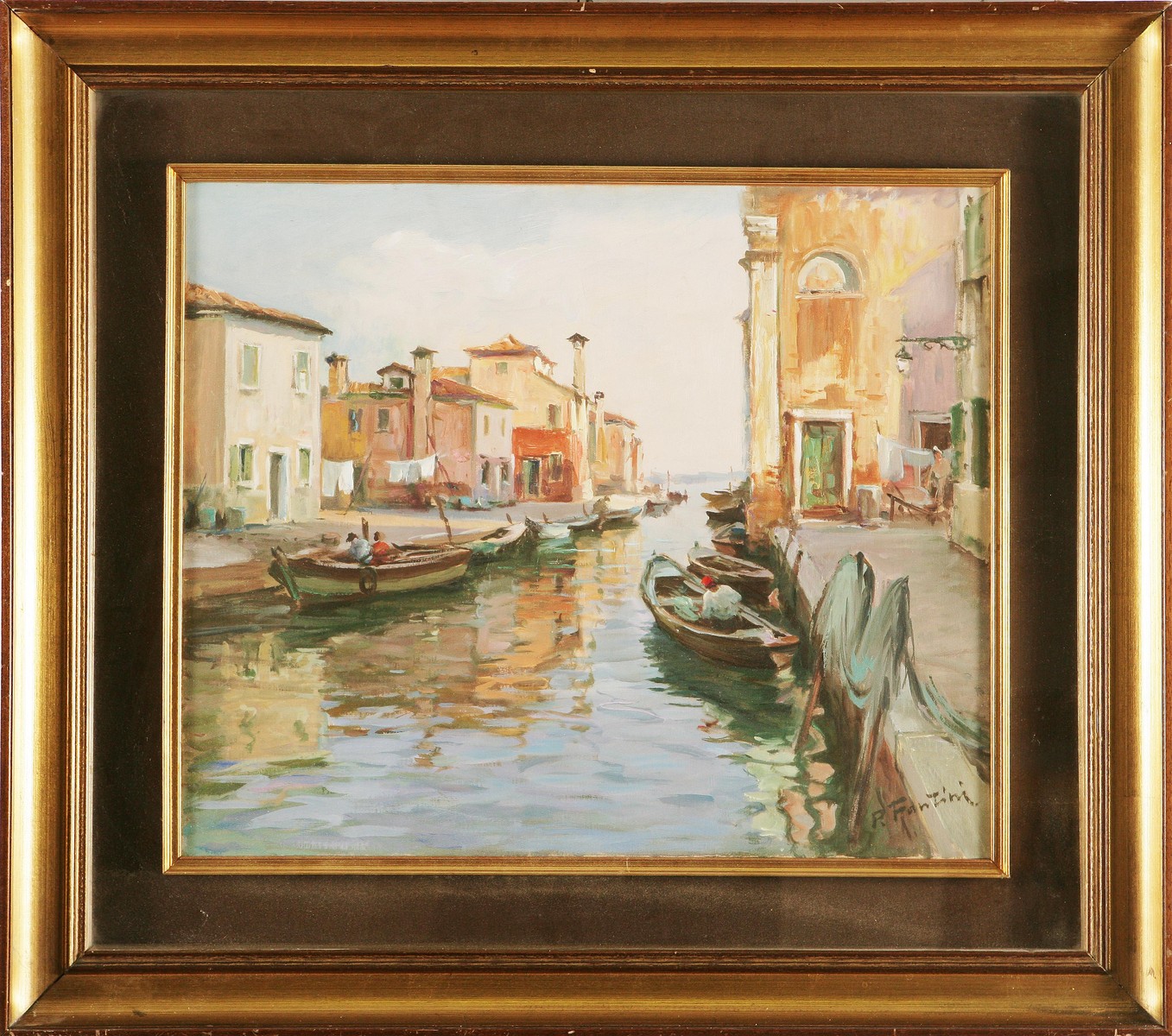 FANTINI P. Canale a Chioggia. Olio su tela, cm 60x50. Firma in basso a destra. Cornice presente.